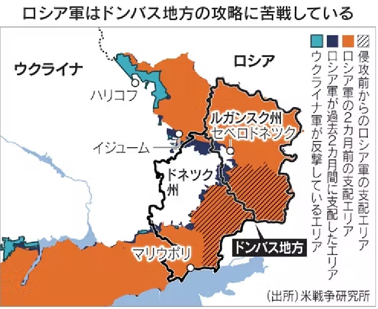 州別の支配面積はルガンスク州で97%、ドネツク州で59%に達する。ロシア軍はルガンスク州の要衝セベロドネツクで膠着する戦況の打開を狙い、隣接するリシチャンスクへの進軍を急いでいる。