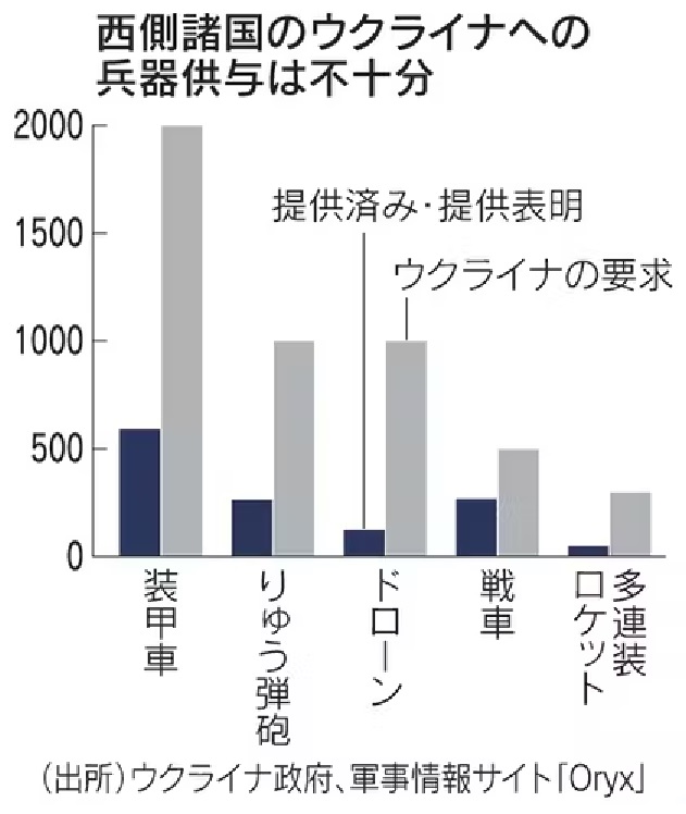 軍事情報サイト「Oryx」の22日時点のデータによると、供与済みまたは表明された兵器数は、要求に対してりゅう弾砲が27%、多連装ロケットシステムは17%だった。戦車も5割強にとどまった。