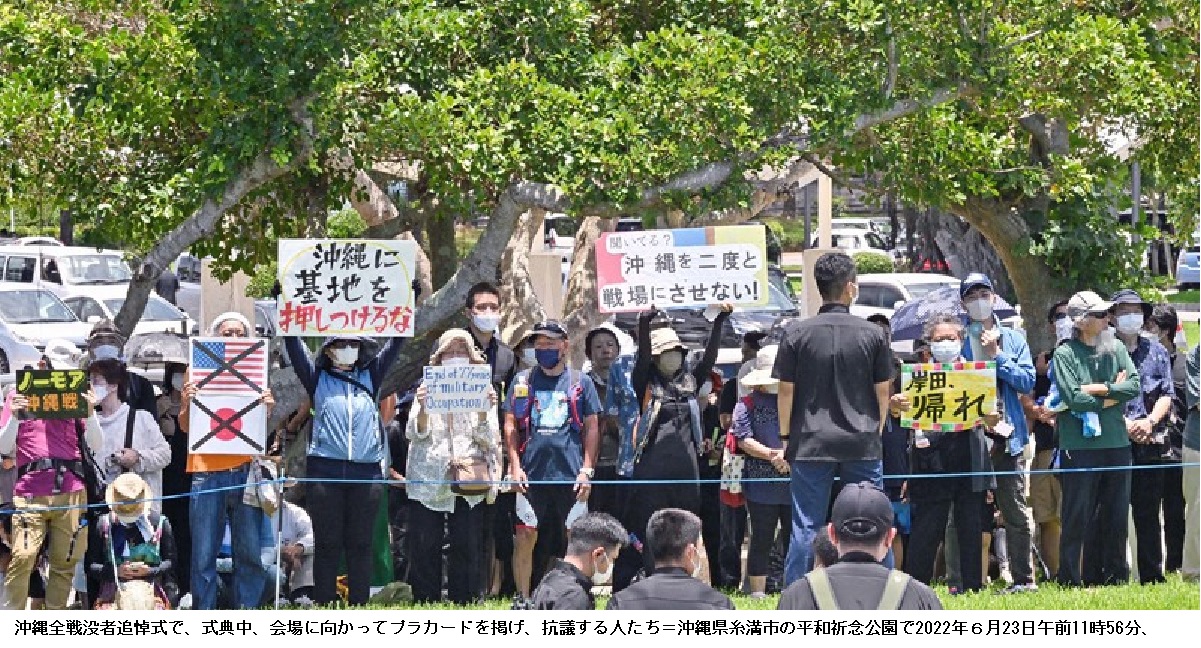 追悼式には県が3年ぶりに首相を招待し、岸田首相は就任後初めて参列した。会場周辺では「岸田、帰れ」「沖縄を二度と戦場にさせない!」などと書かれたプラカードを持った人たちが立ち、岸田首相があいさつすると、「沖縄に基地を押しつけるな」「聞く力見せてみろ」などと怒号が断続的に飛んだ。