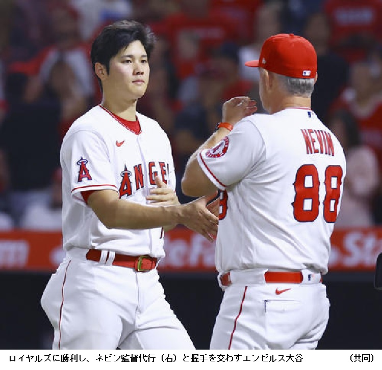 ネビン監督代行は、96球に達していた7回で大谷を交代させようとしたことを明かし「でも彼は断固として聞かなかった。No. This is mine.(ノー。これは僕の試合だ)。続投するとね」と話した。追加点が入り点差が開いたため再び降板を打診すると「またノーと答えた」という。「何というパフォーマンス、何という日だ。自己最多の奪三振もマークした」と称賛し「彼はチームがどういう状況か理解している。明日は試合がないし(2日間ゆっくり)休みを与える良い機会だ。みんな、どこかを痛めていたりして万全ではない」と、大谷がチームを思って続投を志願したことを明かした。 [日刊スポーツ 2022年6月23日16時19分]