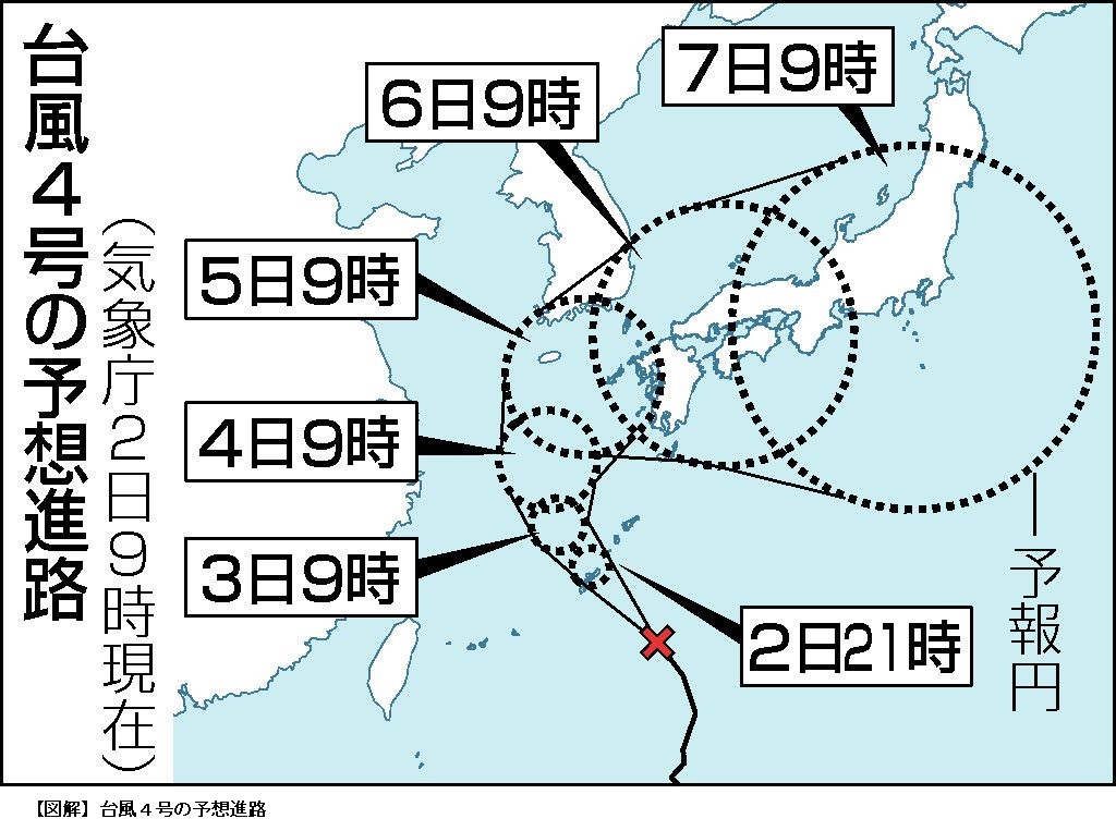 4号は4日に東シナ海を北上し、5日は対馬海峡付近を日本海へ抜けるか、九州に接近、上陸する見込み。東寄りに進んだ場合は6日にかけて西日本を横断する可能性もある。
