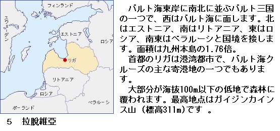 5 拉脫維亞 →バルト海沿岸にあるバルト3国の中央に位置する国