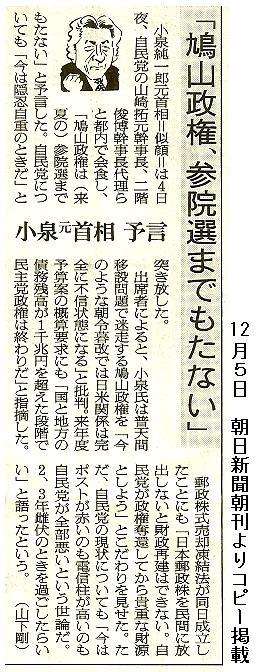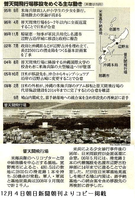 どうやら普天間移設の決着は越年に持ち越されるようだ。本日のウェブニュースに曰く、「普天間移設「新候補地を」、首相が防衛相に指示 ―― 沖縄の米軍普天間飛行場移設問題で、鳩山首相が北沢防衛相に対し「新しい場所を探してほしい」と述べ、日米合意に基づく米軍キャンプ・シュワブ沿岸部(沖縄県名護市辺野古)以外の移設先を探すよう指示していたことが3日、明らかになった。/首相の指示は、移設先の検討を事実上仕切り直すよう求めたものと受け止められている。新たな移設先を見つけるには時間がかかることから、首相は年内の決着を先送りすることにしたとみられる。/首相は3日夜、「年内に決めなきゃいけない、という議論をしているわけではない」と記者団に述べ、年内決着を見送る考えを公の場で表明した。/これに先立ち、首相は3日夕、首相官邸で平野官房長官、岡田外相、北沢防衛相と会談し、4日に都内で開く日米外務・防衛当局の閣僚級作業部会に向けた協議を行った。首相は「連立は大事だ。米国とは誠実に協議してほしい」と述べ、移設問題の決着が遅れても米側の理解を得られるよう指示した。首相はここ数日、平野氏らと連日協議を重ねており、新たな移設先の検討指示もこの中で出た。/複数の関係者によると、首相の念頭にあるのは米領グアムだという。首相は3日、普天間移設を2014年までに完了すると日米が06年に合意した米軍再編のロードマップ(行程表)について「柔軟性を持って臨むことは可能だ」と記者団に語り、移設の時期や場所などを軌道修正する可能性を示唆した。(2009年12月4日 読売新聞)」