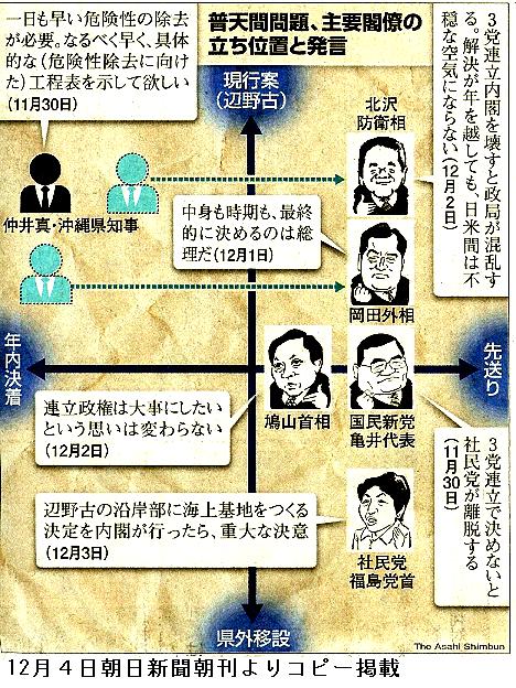 「普天間」越年、小沢氏の影=連立優先に首相逆らえず ―― 鳩山由紀夫首相が米軍普天間飛行場移設問題の年内決着を断念した背景には、来年の通常国会や参院選を見据え、連立相手の社民党に配慮する小沢一郎民主党幹事長の意向があった。日米関係より連立を優先し、基地問題を政局と絡めたことで、決着への道筋は一層不透明となってきた。/「政策の話のつもりかもしれないが、政局になって困るのはあんたらだ」。/先月30日午後、参院本会議散会後の国会。社民党の又市征治副党首は小沢氏に近い民主党の輿石東参院議員会長に対し、普天間問題の結論を先送りさせなければ、連立政権からの離脱も辞さないと迫った。社民党の姿勢に危機感を抱いた輿石氏は「その通り。何であんなに急ぐ必要があるのか」と、年内決着への流れをつくりつつあった政府への不満を示し、小沢氏に直接電話するよう促した。/又市氏からの電話に、小沢氏は最初「内閣の話なんだから、中で福島(瑞穂社民党党首)さんが頑張ればいい」と、政策課題からは距離を置く姿勢を示した。しかし、又市氏が「これは連立の問題なんだから、あんたがやらなきゃいかん」と調整を求めると、小沢氏は「分かった、分かった」と応じたという。/同じころ、首相官邸で開かれた基本政策閣僚委員会では、福島氏が「(名護市の)辺野古沿岸部に基地を造ることにはきっぱり反対する」と表明。国民新党の亀井静香代表も「3党連立で決めないと、社民党は離脱するよ」と加勢した。平野博文官房長官は「3党を飛び越えて決めることは絶対にありません」と約束せざるを得なかった。/この日の夜、輿石氏は同じ「参院民主党」の北沢俊美防衛相を食事に誘った。普天間問題の年内決着を目指していた北沢氏に、輿石氏は小沢氏の意向を踏まえて「年内に慌てて決めることはない。無理してもろくなことはない」とクギを刺した。/翌1日、首相は官邸に岡田克也外相と北沢氏を呼び、平野氏を交えて対応を協議した。平野氏が前日の基本政策閣僚委での福島、亀井両氏の強硬姿勢を伝えると、北沢氏は「連立政権が壊れるようなことがあってはならない」と発言。突然の方針転換の裏に小沢氏の影を感じたのか、首相は異論を挟まず、年内決着見送りが事実上決まった。/民主党は参院での単独過半数獲得に向け、通常国会で子ども手当などの重点政策を実現させた上で、参院選に臨むのが基本戦略だ。だが、社民党が連立を離脱すれば、与党は参院で過半数割れとなるばかりか、衆院での法案再可決もできなくなり、鳩山政権はたちまち窮地に陥る。/「参院選までは辛抱だ」。民主党幹部はこう語り、小沢氏が当面、そうした危険を冒すような選択をすることはないと強調した。(jijicom、2009/12/04-22:51)