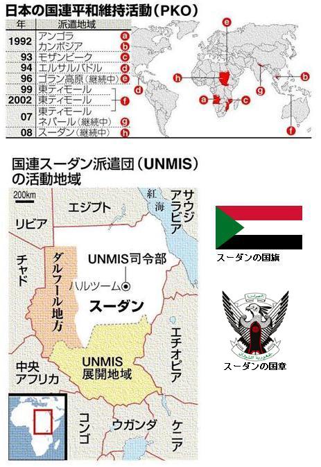 スーダンPKO(Peacekeeping Operation)に数百人規模の部隊派遣検討 ―― 国連平和維持活動(PKO)スーダン派遣団(UNMIS、United Nations Mission in Sudan)について、岡田克也外相が数百人規模の自衛隊部隊を派遣する検討を外務省に指示していることが28日、分かった。すでに外務、防衛両省などによる調整も始まっている。鳩山政権はインド洋で補給活動中の海上自衛隊を来年1月に撤収する方針で、日本の国際貢献活動が細る中、PKOへの積極参加で人的貢献の実績づくりを図る狙いがある。/外務省はこのほか平成14年から約2年間、施設部隊が参加した東ティモールPKOへの陸上自衛隊再派遣の検討も始めている。/スーダンへの派遣対象は、道路整備にあたる陸自の施設部隊や輸送部隊などが想定されている。実現すれば、PKOへの部隊の新規派遣は東ティモール以来となる。/スーダン南部は2005(平成17)年に20年以上続いた内戦が終結した。現在、米国や中国など68ヵ国約1万人からなるUNMISが、和平合意履行の監視や人道支援にあたっている。政府は昨年10月、PKO協力法に基づき、UNMIS司令部に陸上自衛官2人を派遣したが、部隊派遣は見送った。自衛官2人は首都、ハルツームにある司令部で分析情報のデータベース管理と物資補給の調整業務などを担当している。/外務省がUNMISへの部隊派遣を検討しているのは、父親が隣国ケニア出身のオバマ米大統領の誕生で、米国がスーダン和平問題に力を入れ始めたことが背景にある。大統領訪日に先立つ10月、米側は「この地域を重視しているので、何か貢献できないか」と日本側に人的貢献を求めてきたとされる。/民主党は、インド洋への海自派遣など特別措置法に基づく米国などへの支援に否定的立場をとってきた。一方で、衆院選マニフェスト(政権公約)に「PKO等に参加して平和の構築に向けた役割を果たす」と明記しており、スーダン派遣は同党の主張と一致する。/岡田外相は10月下旬の講演で、PKOへの自衛隊派遣を促進するため、紛争当事者間の受け入れ同意などの参加5原則を緩和すべきだとの認識を表明している。UNMIS参加についても「積極的に考えた方がよい」と主張してきた。/ただ、スーダンの治安は依然、不安定で、自衛隊部隊の派遣には、連立を組む社民党の反対が予想される。すんなり実現するかは不透明だ。/現在、自衛官が参加するPKOはUNMIS、中東・ゴラン高原の国連兵力引き離し監視軍(UNDOF、United Nations Disengagement Observer Force)、国連ネパール支援団(UNMIN、United Nations Mission in Nepal)の3つで、計54人。国連側の統計で派遣人数は加盟国中84位にとどまっている。(産経ニュース 2009.11.29 01:16)