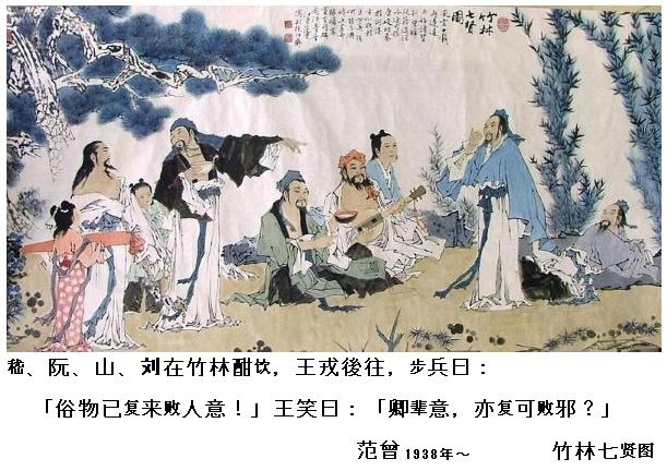 世説新語・賞譽篇第八に曰く、《鍾士季(しょうしき、鍾会、?~263年)は王安豊(王戎)を批評していった。「阿戎(王戎)は人の気持ちをすっかり理解できる人間だ」また、こういった。「裴公(裴楷、237~291年)の話は尽きるところがない。」/史部郎に欠員が出来たとき、文帝(司馬昭)が適当な人物を鍾会にたずねたところ、かれは答えた。「裴楷は万事に明快であり、王戎は簡にして要を得ております。どちらも適任です」そこで裴楷を起用することになった。5》《王濬沖(おうしゅんちゅう、王戎)と裴叔則(はいしゅくそく、裴楷)の二人は、童髪の頃鍾士季を訪れ、しばらくして帰っていった。あとで客が鍾士季にたずねた。「さきほどの二人の子供をどうおもわれるか」鍾士季は答えた。「裴楷は万事に明快であり、王戎は簡にして要を得ている。いまからのち二十年もすれば、この二人はきっと吏部尚書になるであろうが、そのときは天下に埋もれた人材がなくなるという希望が叶えられるであろう」6》《王戎は山巨源(山濤)を批評していった。「山から切り出したばかりのあら玉、手を加えぬ金の塊のようだ。たれもがこれを寶として賞(ほ)めるが、なんの器と呼んでよいかわからない」10》また、容止篇第十四に曰く、《裴令(裴楷)は王安豊(王戎)を批評していった。「目は爛爛と輝き、巌の下に閃く稲妻のようだ」6》《ある人が王戎に告げた。「嵆延祖(けいえんそ、嵆紹、嵆康の子)は高くずば抜けていて、野の鶴が鶏の群れに降り立ったようだ。」王戎は答えた。「君はまだかれの父を見ていないから、そういうのだよ」11》さらに、傷逝篇第十七に曰く、《王濬沖が尚書令であったころ、出仕の礼服を着て軺車(1頭だての小さな遊覧車)に乗り、黄公酒壚(こうこうしゅろ、黄公の酒場)の辺りを過ぎたとき、後続の車に乗っていた客を振り返っていった。「わしは昔、嵆叔屋(嵆康)や阮嗣宗(阮籍)といっしょに子の酒場で飲み明かしたことがある。竹林の遊びにも、その末席につらなっていた。嵆康が早死にし、阮公がなくなってからは、すぐ世間の俗事に縛られる身になり、今これを見ると、近くにありながら、まるで山河を望むように遥かな思いがするよ」2》《王戎は子の万子(19歳で没した)をなくした。山簡(253~312年、山濤の子)が見舞いに行くと、王戎は悲しみに耐えられない様子である。山簡はいった。「まだ乳離れもしない赤ん坊に、それほどまでにする必要はあるまい。」王戎はいった。「聖人は感情を忘れるが、最下等の人間も感情を持つだけの能力がない。感情が集まってくるのは、まさにわれわれのような人間にだよ」山簡はその言葉に感服し、あらためてかれのために慟哭した。