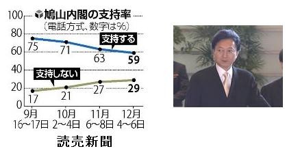 内閣支持続落59%、「首相指導力ない」急増 ―― 読売新聞社が4~6日に実施した全国世論調査(電話方式)で、鳩山内閣の支持率は59%となり、前回11月調査の63%から4ポイント下がった。/不支持率は29%(前回27%)だった。鳩山内閣の支持率は初めて6割を切った。内閣を支持しない理由では「首相に指導力がない」が27%(同13%)に急増した。米軍普天間飛行場の移設問題で、鳩山首相が年内決着を先送りする方針を固めたことなどが影響したとみられる。/沖縄県名護市を移設先とする日米合意については「少しは修正する方がよい」32%(同32%)、「合意通りに進める方がよい」26%(同31%)、「大幅に見直す方がよい」26%(同19%)となった。「少しは修正」と「合意通り」を合わせ、県内移設の現行計画を軸にすべきだと思う人は6割近かった。/首相が偽装献金など自らの「政治とカネ」の問題について、説明責任を果たしているとは思わない人は85%(同73%)に達した。偽装献金問題は母親からの巨額の資金提供疑惑に発展し、首相に向けられる国民の視線は厳しさを増しているようだ。元秘書が起訴された場合の首相の対応については、「辞任する必要はない」が54%だったが、「辞任すべきだ」も37%に上った。鳩山内閣の政策に関してデフレや円高など今の経済情勢に適切に対応していると思う人は20%で、「そうは思わない」68%が大きく上回った。/行政刷新会議の事業仕分けを「評価する」は71%、「評価しない」は20%となった。ただ、今回の事業仕分けに問題があると思う人も63%いた。このうち、問題点として「仕分けにかける時間が短い」を挙げた人が39%で、「仕分け人の議論の進め方がよくない」20%、「対象とした事業が適切でない」「仕分け人の判断が適切でない」各17%が続いた。/民主党が衆院選の政権公約(マニフェスト)に掲げた内容については「必ず守るべきだ」は18%にとどまり、「守れなくても仕方がない」46%、「こだわる必要はない」34%となった。/政党支持率は民主42%(前回43%)、自民19%(同19%)などだった。 (2009年12月7日03時00分 読売新聞)