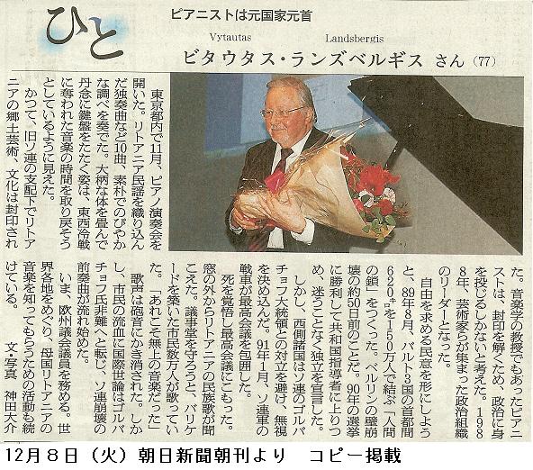 横浜のN氏からのメールに曰く、「日高節夫様/ブログ拝見。金婚式おめでとう。12月5日は盛会だったようで塾友も皆さんの、いつまでも続く友情と恩師を慕う気持ちが嬉しいね。/MN君のメールがまたいい。「多分、私が受精卵だった頃、「先生ご夫妻」が結ばれ」というのが面白い。受精卵という表現は初めて聞く。/実の子供でも、君みたいに、お弟子さんたちから、金婚式を祝ってもらうことは少ないよ。/幸せな人生だね。いや、結構です。/わたしは、先々週、また「聞き書きの旅」に行ってきました。大津、紀伊田辺を済ませ、西宮でKと会ってきました。元気にしていました。/出発時からのどをやられ、夜はホテルで咳をしまくりましたが、帰宅したら咳も治って、なんとか、インフルエンザではなかったことが分かりました。/我々の体には、すでに過去のインフルエンザの抗体があるのではないでしょうか。/きょうは中学の時の高校演劇の原点「修禅寺物語」を国立劇場まで観に行きます。/風邪を引かないように散歩を続けてください。」