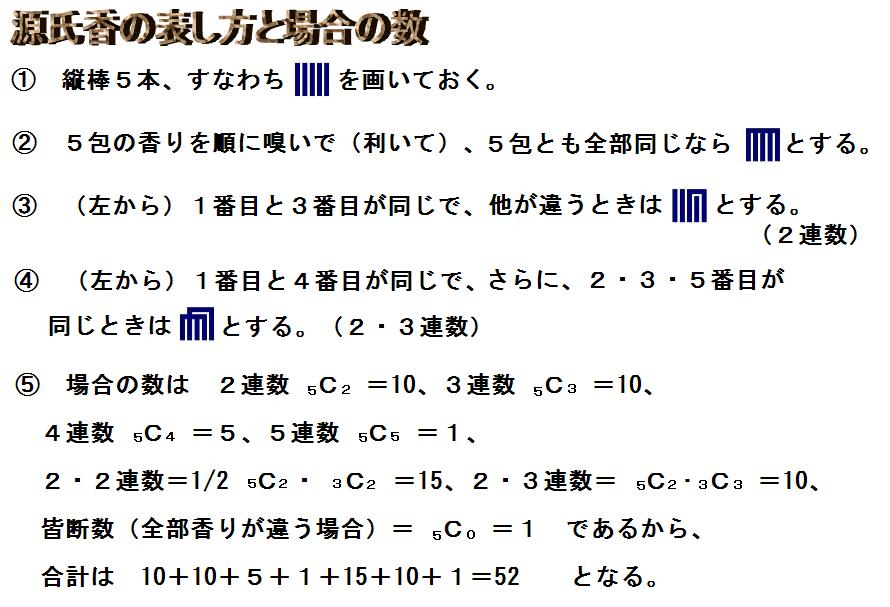 以下、「源氏香の表し方と場合の数」のようにすると、全部で52の違った形をつくることができる。すなわち、5種類の香から重複を許して5包の香りを作り、これを焚いて香りを利き分けるとき、52通りの違った場合が考えられる。