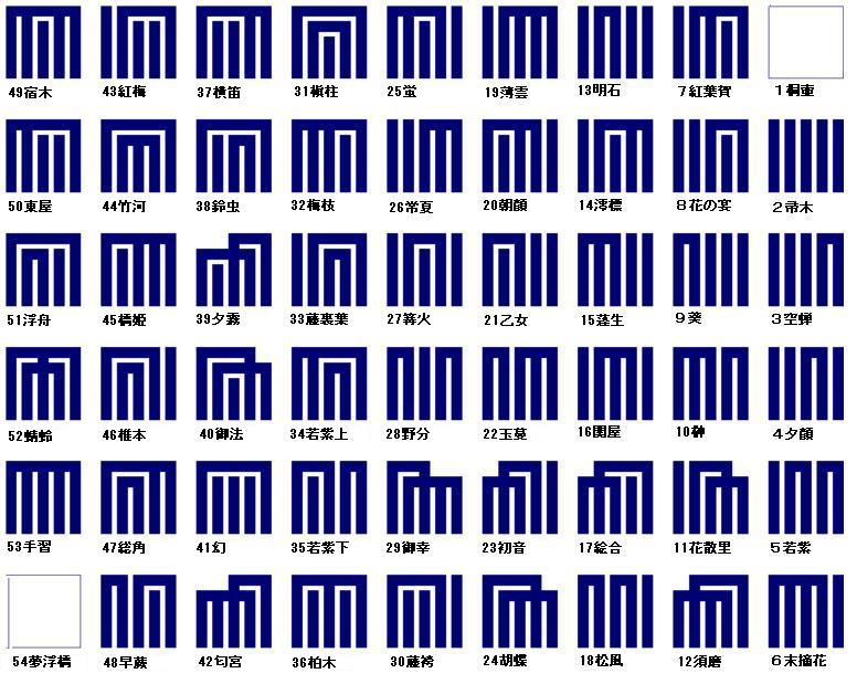 紫式部の『源氏物語』は54帖あり、この54帖の初めの「桐壺」と最後の「夢浮橋」を省いた残りの52の題名にこの利き分けた香りの記号の名前を当てるのである。