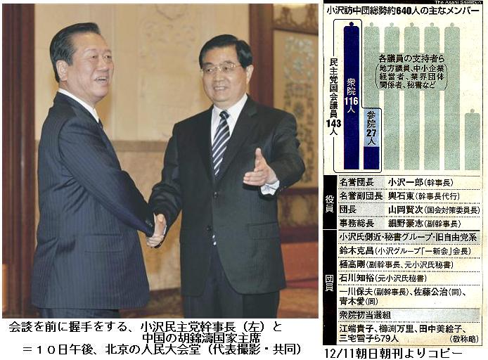 小沢氏、胡中国主席と会談「私は人民解放軍の野戦軍司令官」―― 【北京=原川貴郎】民主党の小沢一郎幹事長は10日午後、北京に到着し、人民大会堂で胡錦濤(こ・きんとう)中国国家主席と会談した。両氏は、日中関係の強化や民主党と中国共産党の政党間交流の促進を図ることで一致した。/小沢氏は会談後、記者団に対し、来夏の参院選について胡氏に、「こちらのお国(中国)に例えれば、解放の戦いはまだ済んでいない。来年7月に最終の決戦がある。人民解放軍でいえば、野戦の軍司令官として頑張っていると伝えた」と語った。/他の先進国の主要政治家が、天安門事件で民主化運動を武力で鎮圧した人民解放軍の幹部に自らをなぞらえることはあり得ない。/小沢氏はまた、「参院選で民主党が過半数を取ることで、思い切った議論をできる環境が整い、関係を深めることができる」と語ったことも紹介した。/胡氏は「民主党政権になってからも交流を深め、日中の互恵関係が新たな段階に入った」と語り、鳩山政権のアジア重視の姿勢を評価した。 (2009.12.10 23:30、産経ニュース)