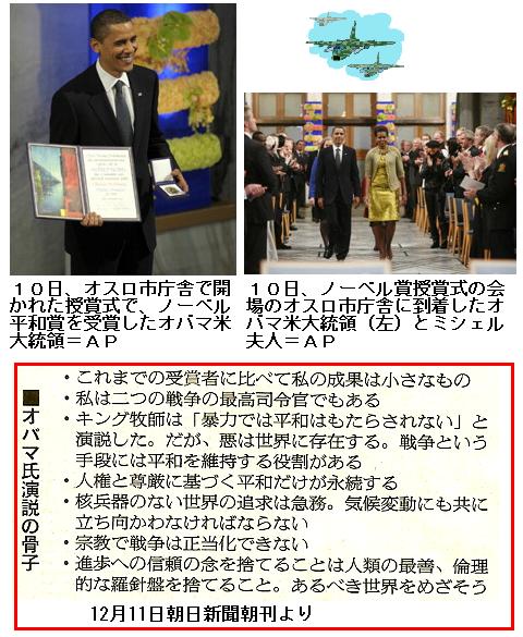 ノーベル賞授賞式:米大統領、核軍縮「私の外交の中心」 ―― 【オスロ笠原敏彦】「核兵器なき世界」の目標などを掲げて国際外交を強化したことが評価され、ノーベル平和賞に決まったオバマ米大統領への授賞式が10日、ノルウェーのオスロ市庁舎で行われた。大統領は記念演説で、米軍の3万人増派を柱にしたアフガニスタン新戦略を踏まえ、「戦争があっても、平和への努力は可能だ。我々はできる。それが人類の進歩の物語であり、世界中の希望だ」と述べた。/オバマ大統領は、平和賞受賞の是非が論議を呼んでいることを率直に認め、「軍事紛争の犠牲に心を痛めながら(授賞式に)来た」と心境を披露。その上で、イラクとアフガニスタンで二つの戦争を進める米軍の最高司令官として「戦争と平和」の問題について率直に語り、「必要な戦争」への理解を求めた。/大統領は、同じく平和賞受賞者の米国の黒人公民権運動指導者キング牧師が受賞演説で「暴力は決して恒久的な平和をもたらさない」と語った言葉を引用。キング牧師の業績が黒人初の米大統領を可能にしたとの認識を示しながらも、非暴力主義だけで国家は指導できないとし、「時に軍事力が必要だと考えるのは、歴史や人間の不完全性、道理の限界を認識するからだ」との哲学を示した。/一方で、ケネディ元米大統領の「より現実的で、達成可能な平和に集中しよう。それは、人間の性質の突然の進化ではなく、人間の慣行の漸進的な進化に基づくものだ」の言葉への共感を表明。「戦争という手段には平和を維持するという役割もある」と述べ、最高司令官としての現実主義的な側面を強く打ち出した。/また、主な授賞理由である「核兵器なき世界」については、核拡散防止とあわせ「私の外交政策の中心を占めるものだ」と語り、引き続き核軍縮を推進していく意思を表明した。気候変動問題にはあまり触れず、より広義の「平和」を達成するためにも、「世界が団結して取り組まなければならない」と訴えるにとどまった。/現職米大統領の平和賞受賞は1906年のセオドア・ルーズベルト、19年のウィルソン両大統領に続いて3人目。元職では、2002年にカーター元大統領が受賞している。/賞金1000万スウェーデン・クローナ(約1億2000万円)を慈善事業に寄付する意向を示している。(毎日新聞 2009年12月10日 21時12分)