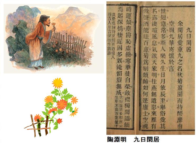 詩 読み:世(よ)短(みじか)くして 意(い)は常(つね)に多(おお)し/斯(ここ)に人(ひと)久生(きゅうせい)を樂(よろこ)ぶ。/日月(にちげつ)辰(とき)に依(よ)って至(いた)れるに、/俗(ぞく)を 舉(あ)げて其の名を愛(あい)す。/露(つゆ)は淒(せい)として暄風(けんぷう)息(や)み、/氣(き)は澈(す)みて天象(てんしょう)明(あきら)かなり。/往燕(おうえん)遺影(いえい)無く、/来雁(らいがん)餘聲(よせい)有(あ)り。《訳:人生は短く悩みことばかり多い。そのため人間はだれしも永久に生きたいと思っている。九月九日という月日は毎年季節通りに巡ってくるのだが、それでも世間ではこぞってこの吉日を大事に思って菊酒を楽しむわけだ。この時季になると露はひんやりとして暖かい風も吹かなくなり、大気は澄んで空はくっきりと晴れ上がる。飛び立った燕はもはや影を留めず、飛んできた雁はあたりに声を響かせている。》//酒は能(よ)く百慮(ひゃくりょ)を祛(はら)い、菊(きく)は為(ため)に頽齡(たいれい)を制す。/如何(いか)んぞ蓬廬(ほうろ)の士(市)/空しく時運の傾くを視(み)るや。/塵爵(ぢんしゃく)に虚罍(きょらい)を恥じ、/寒華(かんか)は徒(いたづ)らに自(おのずから)ら榮(さか)ゆ。《訳:酒はもろもろの心配事を除き去るし、菊は年をとるのを抑えるという。あばら家の主よ、それなのにどうして時の過ぎ去るのを(酒杯を手にせず)そのまま見過ごしているのか。盃に埃がつもっているのをみて、空っぽの酒樽が恥ずかしく思う。眼前には秋の菊だけが徒に咲き誇っている。》//襟(えり)を歛(おさ)めて獨(ひと)り閒(しず)かに謠(うた)えば、/緬焉(めんえん)として深情(しんじょう)起(おこ)る。/棲遲(せいち)固(もと)より娯(たの)しみ多(おお)く、/淹留(えんりゅう)豈(あ)に成(な)る無(な)からんや。《訳:襟をかき合せてひとり静かに詩を作れば、はるかに感慨がこみ上げてくる。思うにこのような安らかな暮らしには、楽しさがいっぱいあるものだ。ここに長く留まっていれば、何とかならないでもあるまい。》
