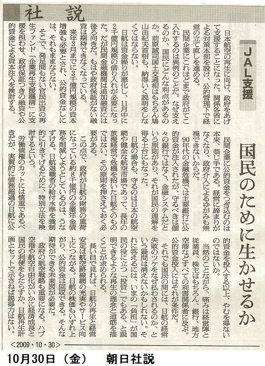 NIKKEI NET に拠れば、《前原誠司国土交通相は30日の閣議後の記者会見で、国交省、内閣府など関係省庁で構成する「日本航空再建対策本部」を設置すると表明した。同日夕に国交省で初会合を開く。公的機関の企業再生支援機構が日航への支援を決定するまでの間、運航に支障が出ないような措置を協議する。つなぎ融資への政府保証、企業年金の減額などを検討する見通しだ。/国交相は会見で「再建途中に日航が飛び続けることが日本経済や地域の足にとって極めて重要。これにどう万全をつくすかが大事」と本部設置のねらいを説明した。国交相を本部長に内閣府、財務、総務、法務、厚生労働、経済産業の各省庁の副大臣で構成する。/国交相は「再建計画の実行にあたり様々な問題が出てくる。対策本部を中心に関係省庁と連絡を緊密に取る」と表明した。日航は11月中に2000億円規模のつなぎ融資が必要とされ、企業再生支援機構の支援決定は間に合わない。日本政策投資銀行など銀行団は政府保証を求めており、保証をどう付与するかが当面の焦点となりそうだ。(12:01) 》とある。