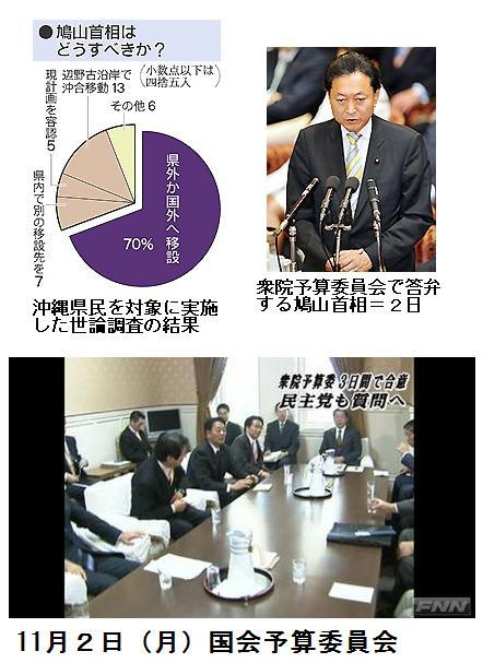 各党代表質問で鳩山由紀夫首相の答弁に押された自民党は、2日の衆院予算委員会を今国会最大の山場と位置付け、質問者に大島理森幹事長らベテラン議員を配した。民主党政権のアキレスけんである米軍普天間飛行場(沖縄県宜野湾市)の移設問題を追及し、首相から「県民の理解を頂ける結論を出さなければならない」との答弁を引き出すなど、政権の選択肢をさらに縛って追い込むことには成功した。それでも、焦点と目された、首相が抱える偽装献金問題への追及は鈍く、自民党の存在感を示すまでには至らなかった。(以下略)