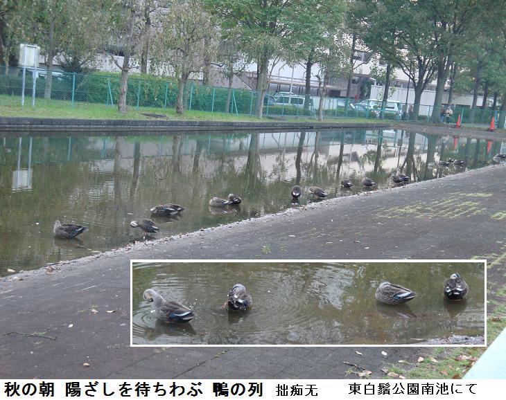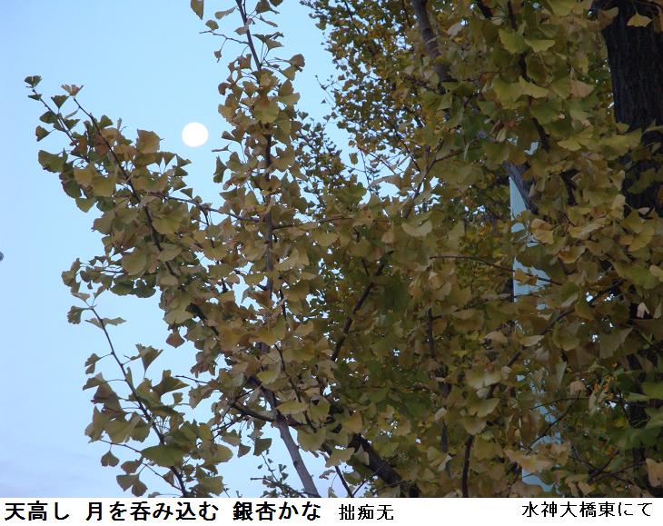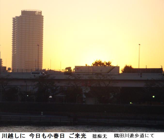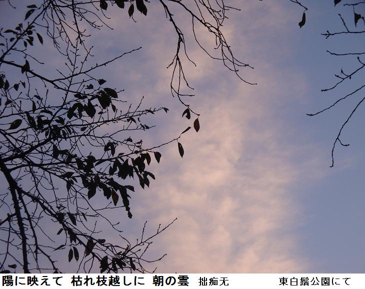 本日はここ2・3日の冷え込みも和らぎ、朝早く目覚めたので、午前5時30分――まだ暗いうちに徘徊に出掛けた。秋の朝焼けを見ながら桜橋を渡ると墨堤通りを北上、東白鬚公園に掛かるころには明るくなり始めた。公園の葉を落とした枯れ枝の間から、朝日を受けてキラキラ輝いている秋の白雲。西の空には、望を過ぎた月が掛かっている。水神大橋を渡り、隅田川沿いを南下して帰宅した。万歩計の持参を忘れたので記録無し。件の徘徊から9000~10000歩、6~6.5㎞か?