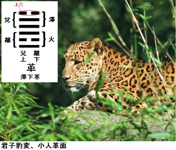 「君子豹変」について調べてみた。易経第49番目の卦(け)「革(離下兌上、澤火革)」にある(6番目の爻、最上段の陰爻)上六の爻辞にある『君子豹変、小人革面(君子豹変す、小人は面を革む)』とあるのが原典である。「革命成就の秋(とき)であるから、その事業に参与した君子――有位有徳の士人の功業は豹の毛が美しく変わるように輝かしい。無位無徳の小人ならば面持ちを改めて、新しい君主の為す所に随従すべきである」という意であって、俗に言われているように「すばやく変わること」ではない。