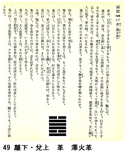 爻辞:初九(最下段の陽爻)は、革新の時のはじめ、まだその期が熟さぬから、黄牛の革(黄は中央の色、牛は従順の動物、革は堅固の物、従って中庸従順の徳を堅持するたとえ)でわが身を固く守らねばならぬ。《象伝:鞏(かた)むるに黄牛を用うというのは、まだなにかをしようとしてはならないということである。》/六二(下から2段目の陰爻)はすでに革むべき日に至ってこれを革める象、思い切って進んで事を断行しても、吉であって咎はない。《象伝:已日にしてこれを革むというのは、行って嘉(よ)い事が得られるということである。/九三(下から3段目の陽爻)は事に当っていささか早急に失しやすい。従って軽率に進めば凶であり、目的は真正であっても危険である。しかし革むべしという衆議が三度までまとまれば、事を断行しても人から孚(まこと)とされるであろう。《象伝:革言三度就ければ、もはや事を断行する以外にどうしようがあろう。/九四(最下段から4段目の陽爻)は位が不正なので本来は悔あるべきだが、陽剛の徳を以って事を革めようとするのだから、その悔も消え去るであろう。だから誠意をもって天命を革めるという大事業にあたれば、吉である。《象伝:天命を改めても吉だというのは、人々がその志の正当なことを信じてくれるからである。/九五(下から5段目の陽爻)天下を革新して大事業を完遂して立派な功績を挙げるべき名君の象。すなわちこのような大人は、虎が夏から秋に掛けて毛を抜け変わらせ、たちまちにしてその毛皮の美しさを増すのにも譬えられる。もはや改めて占うこともなく、人から孚とされるであろう。《象伝:大人虎変すというのは、その毛の文様(もよう)がさらに炳(あきら)かに輝くことである。/上六(最上段の陰爻)は革命成就の秋(とき)であるから、その事業に参与した君子――有位有徳の士人の功業は、豹の毛が秋になって美しく変るように輝かしい。また無位無徳の小人ならば面持ちを革めて、新しい君主のなすところに随従すべきである。ただし革命の事業は重大なことであるから、さらにそれをおしすすめてしばしば民生を疲労させることは凶である。じっとその成果を享受していれば、貞正で吉である。《象伝:君子豹変すというのは、その毛の文様が蔚然(うつぜん、草木の生える様子)として美しくなるということである。小人面を革むというのは、従順に新しい君に従うということである。