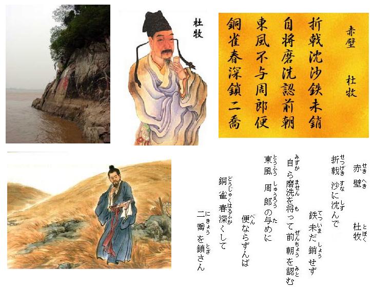 杜牧の「赤壁」の訳: 砂に埋まって錆びていない矛。赤壁の戦いの激戦を物語る遺物。もし、東風が周瑜のために吹かなければ、二人の美人(周瑜の妻と彼女の姉)は、敵の曹操のものになってしまっていただろう。