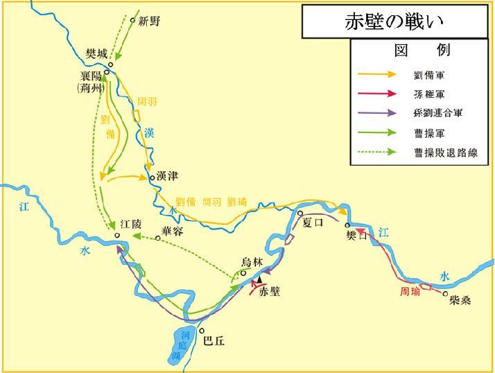 魯粛は劉備に孫権と同盟を結んで曹操と対抗するように説き、劉備は諸葛亮(しょかつりょう、181~234年)を使者として派遣して孫権と同盟を結び、孫権は周瑜・程普(ていふ、生没年不明)ら数万の水軍を劉備の救援に派遣した。一方の曹操軍も長江を下り、両軍は赤壁で一戦を交え、周瑜らは疫病に悩まされていた曹操軍を撃破した。曹操は後退し烏林に陣を張り、周瑜らも長江を挟んで対峙(たいじ)した。
