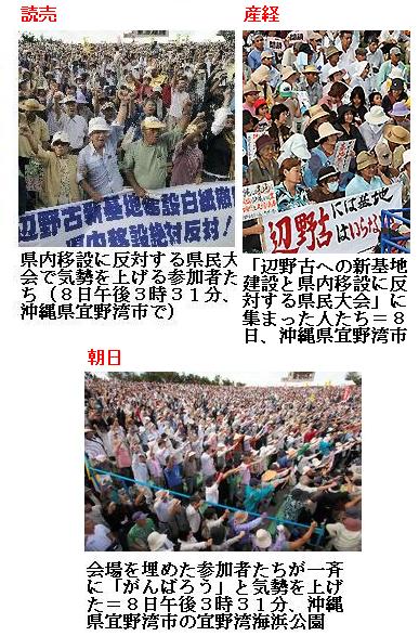 自公の支援で3度の当選を重ねてきた那覇市の翁長雄志市長は保革の枠を超えて出席。「県民の心は基地の整理、縮小という点で一つになることができる」とし、「(鳩山首相が)県外移設を決断できない場合、沖縄では『友愛』という言葉は封印してもらいたい」と主張した。米空軍嘉手納基地を抱える同県北谷町の野国昌春町長は、岡田外相が同基地への統合案を検討していることに触れ、「(今でも)住民の負担は限界に来ている」と訴えた。