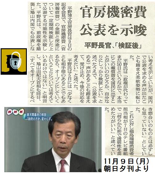 この中で平野官房長官は、福島消費者・少子化担当大臣が7日、いわゆる官房機密費などの使いみちを一部、公開することも含め改善策を検討すべきだという考えを示したことについて、「適切な支出は当然であり、そのことも含めて政権が代わったから公開するかどうかの議論があることは承知している」と述べました。そのうえで平野官房長官は「官房機密費が本来もっている意味合いや、使用目的などを考えると、現時点で、その目的に照らして適切に処理していく方針に変わりはない」と述べ、現時点で使いみちを公開することは考えていないことをあらためて明らかにしました。その一方で、平野官房長官は「国民に公開することがいいのかどうか、自分なりにしっかり検証したい。公開すべきだという声があることも受け止め、今後の対応は考えたい」と述べ、今後、官房機密費の使いみちを公開するかどうか検討する考えを示しました。