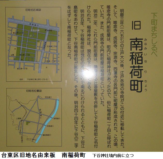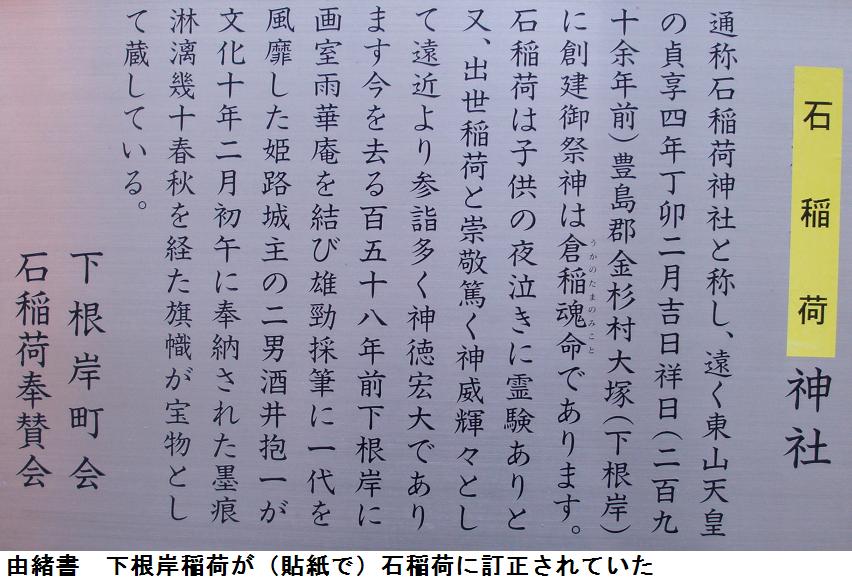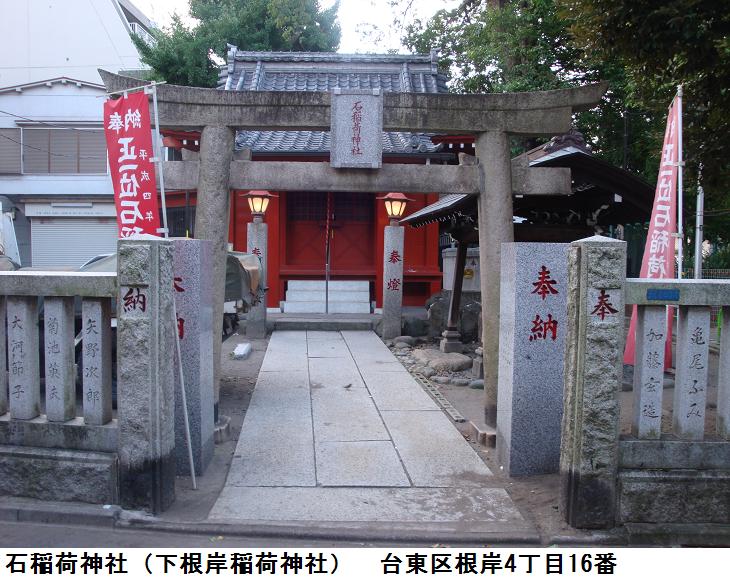 小学校の横道を南に少し入った裏手に「下根岸稲荷神社」がある。鳥居には「石稲荷神社」とある。鳥居は石造の明神鳥居、拝殿と氏子の集会場が廊下でつながれているらしい。お稲荷様だからお狐様を探したが、お狐様の鎮座する台座らしきものは本殿の両端にあるのだが、何処へお出かけか不在である。台座の前には簡単な由緒書の立て札があった。