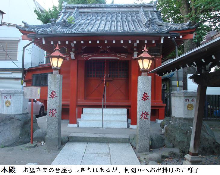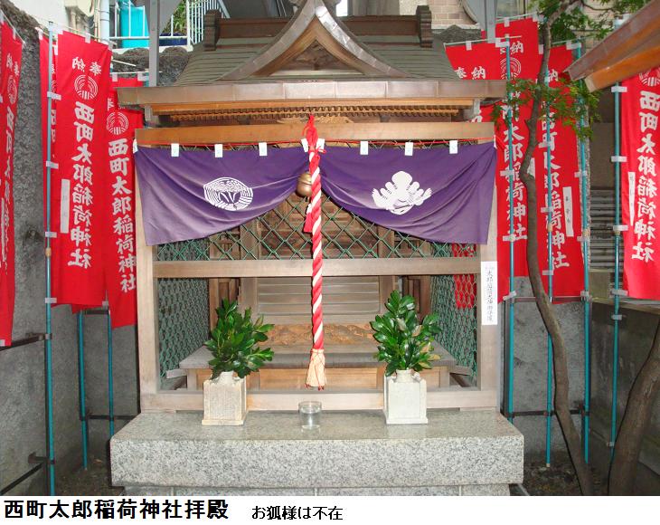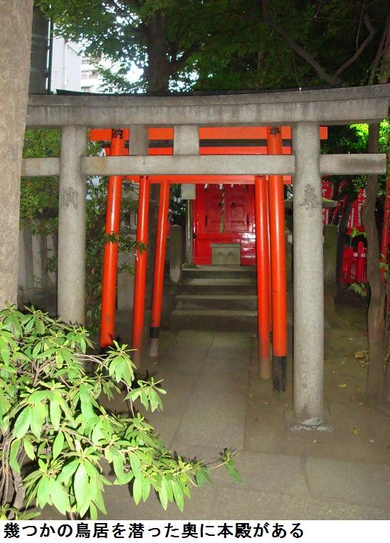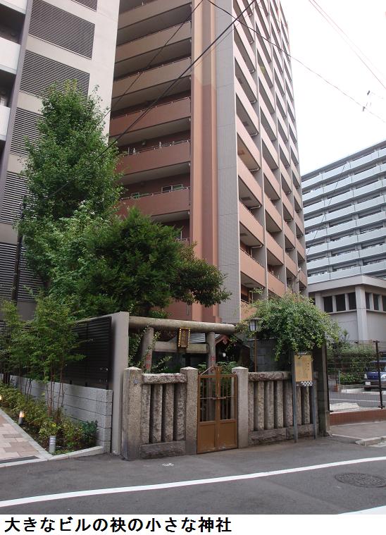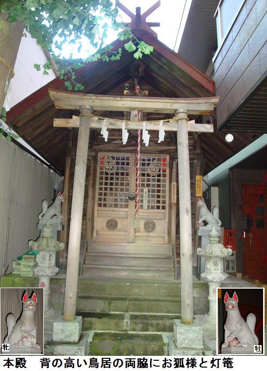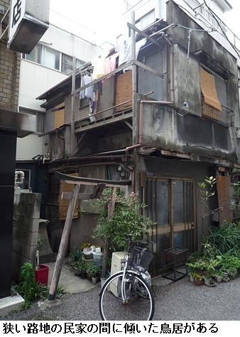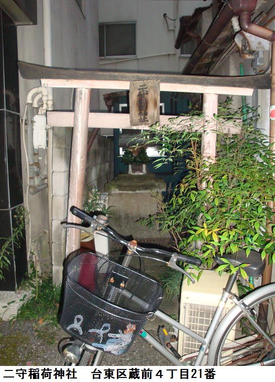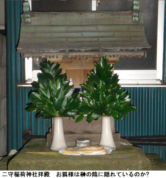 いやはや、表通りはビルが立ち並んだ、1等地のように見えるが、1歩路地に入ると昔の古びた木造民家が沢山残っている。ふと見るとそれらの民家と民家の間に傾きかけた木造の鳥居があり、その前は自転車置場となっている。鳥居にある社名を見ると「二守稲荷神社」とある。鳥居の奥にそれこそ小さな拝殿があり(奥にある民家の通し窓の下)、真新しい榊が捧げてあり、拝殿の前が覆い隠されていてその様子は判らない。ここにも由緒書き等一切無く、お狐様にも会えなかった。もしかしたら、供えられている榊の向こうに隠れていらっしゃるのかもしれない。