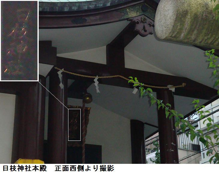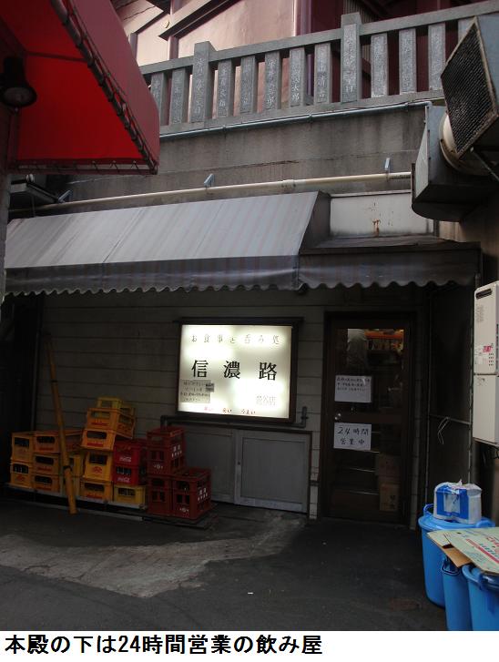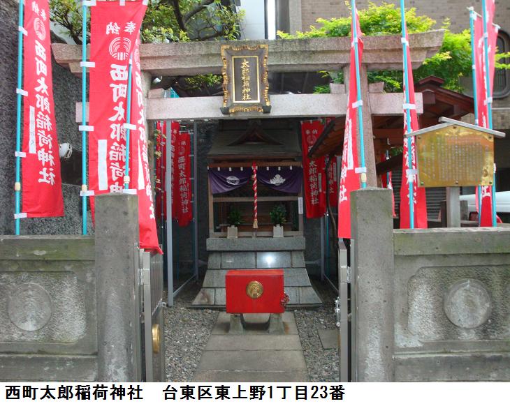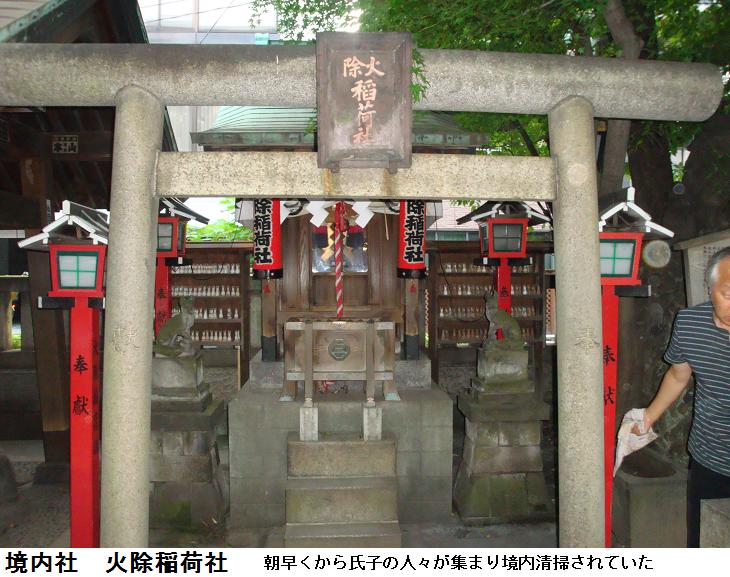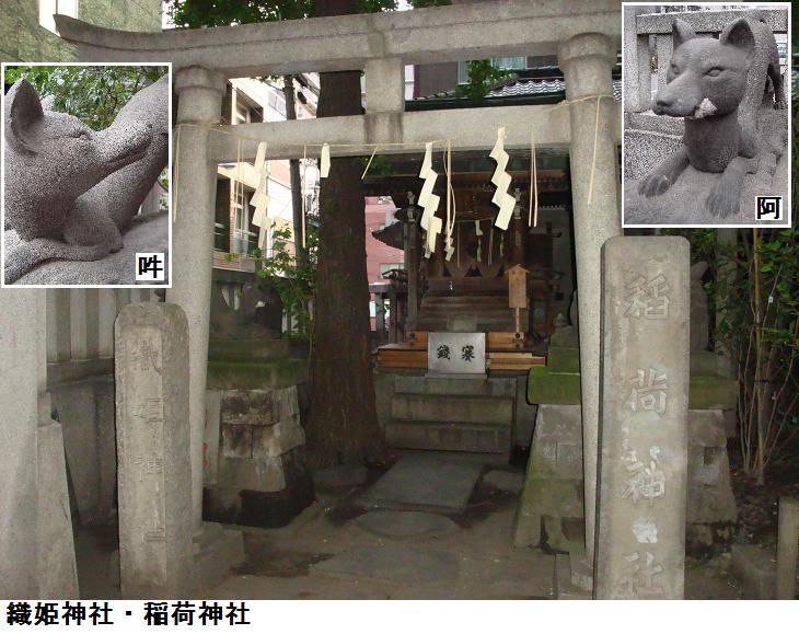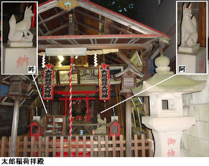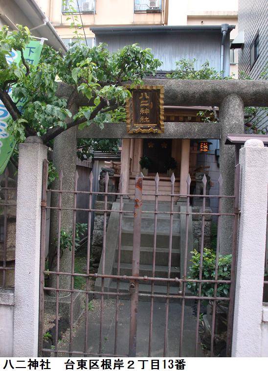 いやはや、表通りはビルが立ち並んだ、1等地のように見えるが、1歩路地に入ると昔の古びた木造民家が沢山残っている。ふと見るとそれらの民家と民家の間に傾きかけた木造の鳥居があり、その前は自転車置場となっている。鳥居にある社名を見ると「二守稲荷神社」とある。鳥居の奥にそれこそ小さな拝殿があり(奥にある民家の通し窓の下)、真新しい榊が捧げてあり、拝殿の前が覆い隠されていてその様子は判らない。ここにも由緒書き等一切無く、お狐様にも会えなかった。もしかしたら、供えられている榊の向こうに隠れていらっしゃるのかもしれない。