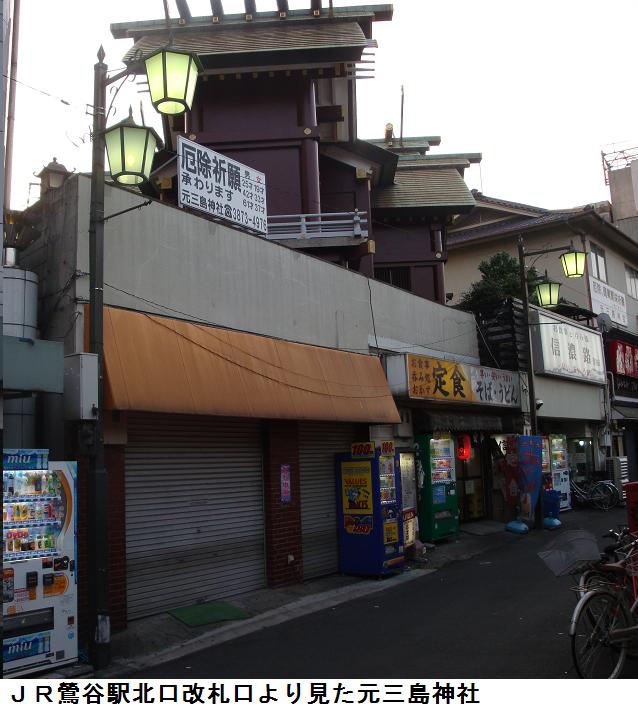 言問通りを鶯谷駅北口まで西に進む。北口の改札口から、本殿は見えるが、これが元三島神社らしい。入口が判らない。