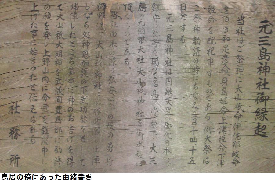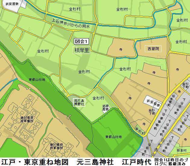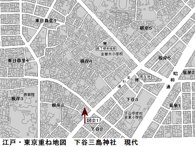 江戸名所図会には浅草三島神社は、元禄年中(1688~1704年)に下谷坂本(現:下谷1~下谷3)にあった社を浅草に移転したとある。新編武蔵風土記稿には寛永6(1629)年までは小名根岸(位置不明)にあって御用地となったために移転したがご神体を熊野社に仮設置していたのでこの地を元三島という、とありる。上野寛永寺の造営開始が1625年頃であるから、旧三島社の最初の移転がこれかも知れない。以後寛永寺には社領が次々に幕府から寄進されてゆくのである。縁起と名所図会の移転年に数十年のずれがあるのは、明暦の大火が1657年であるから浅草移転直後にこの大火で焼失し、いったん下谷坂本に再建された後に再び浅草に移転したことが錯綜しているのかもしれない。浅草から当地に再び移転したのは江戸名所図会の完成(1832~1850年頃)ということになる。なお、足立区の扇2丁目にも三嶋神社があるという(未散策)。こちらの縁起は江戸初期にその地の開拓を行った阿出川権左衛門知康の勧請(1620年頃)によるようで、別当が当社と同じ金杉西蔵院となっているので、これも上野山にあった旧三島神社が原形である可能性もある。