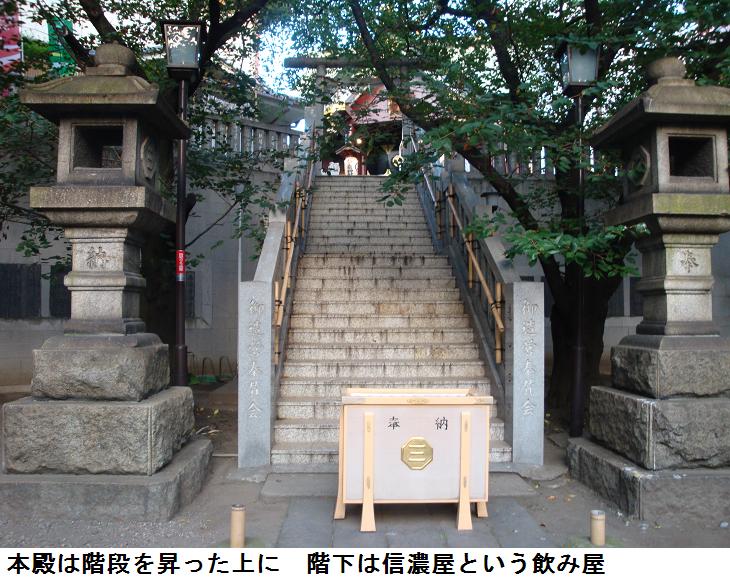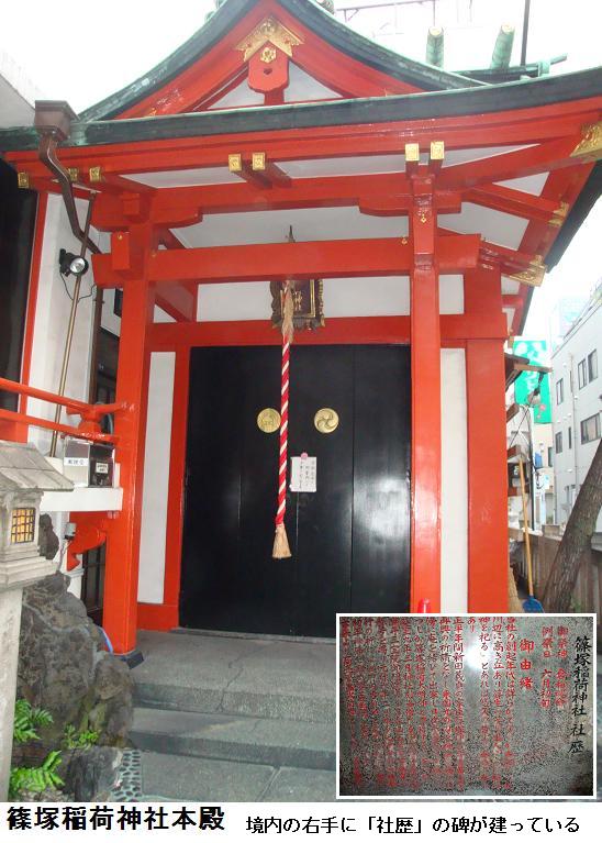 篠塚稲荷神社は拝殿の扉が閉まっていて、お狐様にも会えなかったが、今日訪ねたお稲荷さんでは一番立派な造りである。花街時代の名残を残す神社らしく、玉垣には、料亭などの名前が刻まれているが、現存するのは百万石(元料亭で現在は、とんかつ屋)、伝丸(元料亭で現在は、日本料理店)、梅花亭(過去も今も、和菓子屋)くらいかな。鳥居を潜ると右手に「社歴」を書いた石碑に曰く、「当社の創起年代は詳らかでありませんが、/古記に「大川辺に高き丘あり篠生い茂り里人ここに稲荷神を祀る」とあれば悠久の昔より奉斎し奉っております。/正平年間(1346‐69年)新田義貞の家臣篠塚伊賀守重広主家、再興の祈請をなし来、国光の刀を神前に捧げ社傍に庵を結んで出家し、日夜参籠を怠らず、為にいつしか篠塚稲荷大明神と尊称するに至りました。/延宝9年(1681年)3月、神社別当僧たる伊賀守子孫に醍醐寺三宝院御門跡より篠塚山玉蔵院宗林寺の称号を賜り、元禄6 (1693) 年2月、本多紀伊守殿寺社奉行の折には御府内古跡地と定められましたが、明治初年神仏分離の際、玉蔵院は廃せられました。/古来より商売繁盛火防神として厚く尊崇奉っております」