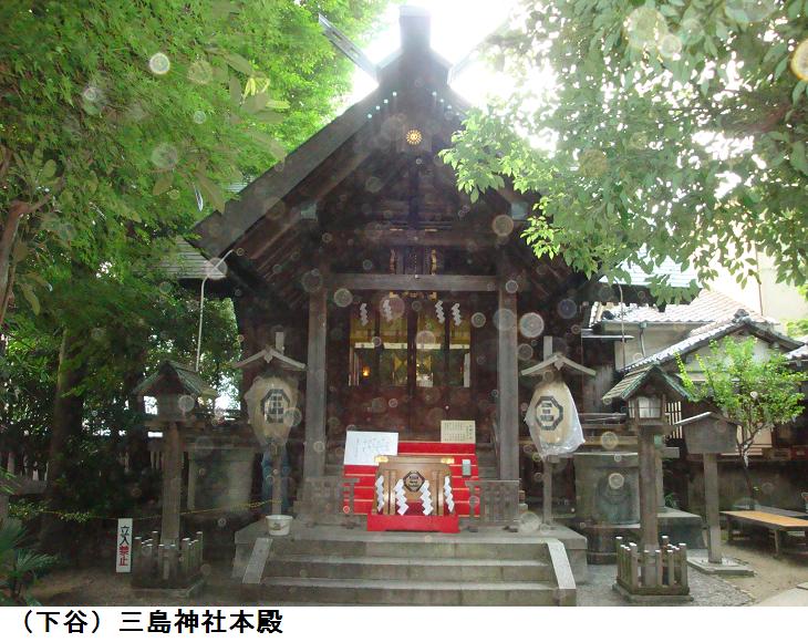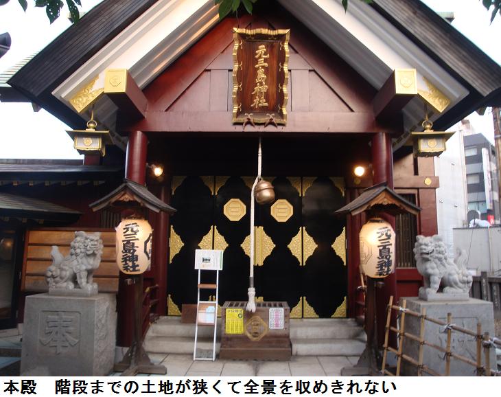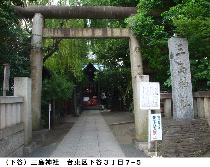 元三島神社の縁起は、先だって記した寿三島神社の縁起と同じである。下って、旧三島社は徳川幕府から社領を受けるが(位置不明)御用地となったために浅草小揚町(現、蔵前4)に移転する(1650年)。浅草小揚町から当地に再び移転したのは金杉村(現在の根岸~下谷)から遠くに社が離れてしまったため氏子の要望によるもので、当地にあった熊野権現社と合祀して現在の元三島神社となったのである。祭神は大山祇命(おおやまづみのみこと)で、上津姫命 下津姫命 和足彦命 身嶋姫命を配祠する。また、伊佐那岐命を合祀する。鶯谷駅裏の盛り場の真ん中にあり下階が飲食店、その2階に鎮座します。それでも境内に入るとふっと喧噪から離れるから不思議である。前述の通り台東区には3つの三島神社がある。当社と浅草三島神社と下谷三島神社である。縁起はすべて同じであるが、江戸名所図会に記載されているのは浅草三島神社で当社と下谷三島神社は記載がない。(江戸末期の地図(1850年頃)には浅草三島神社と当社の2社が記載されている)。