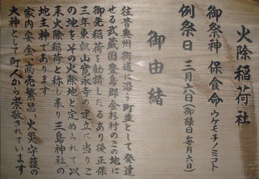 旧日光道中(現、金杉通り)に面しているが、新編武蔵風土記稿に金杉村の地名由来は鶴岡八幡宮の文書(1399年)に当地に金曽木三郎なる人物の事跡がありこれによる、とある(当地に金曾木小学校あり)。江戸末期の地図には近隣に御獄社、石稲荷社、稲荷社があり、当社の場所には火除地がある。御獄社が配祀の木花開耶姫命、日光道中近くにあった稲荷社が地主神の火除稲荷社となっていると推定されるが詳細は不明である。なお、先だって訪ねたように石稲荷社は下根岸稲荷として江戸地図と同じ場所に現存している。