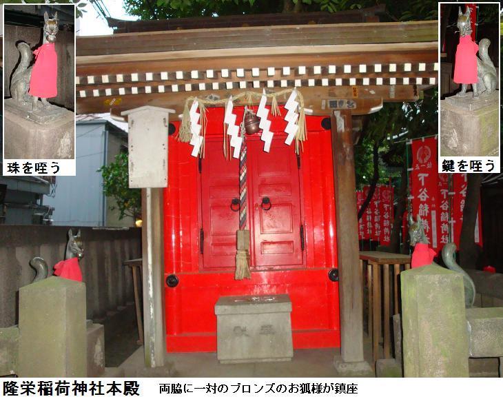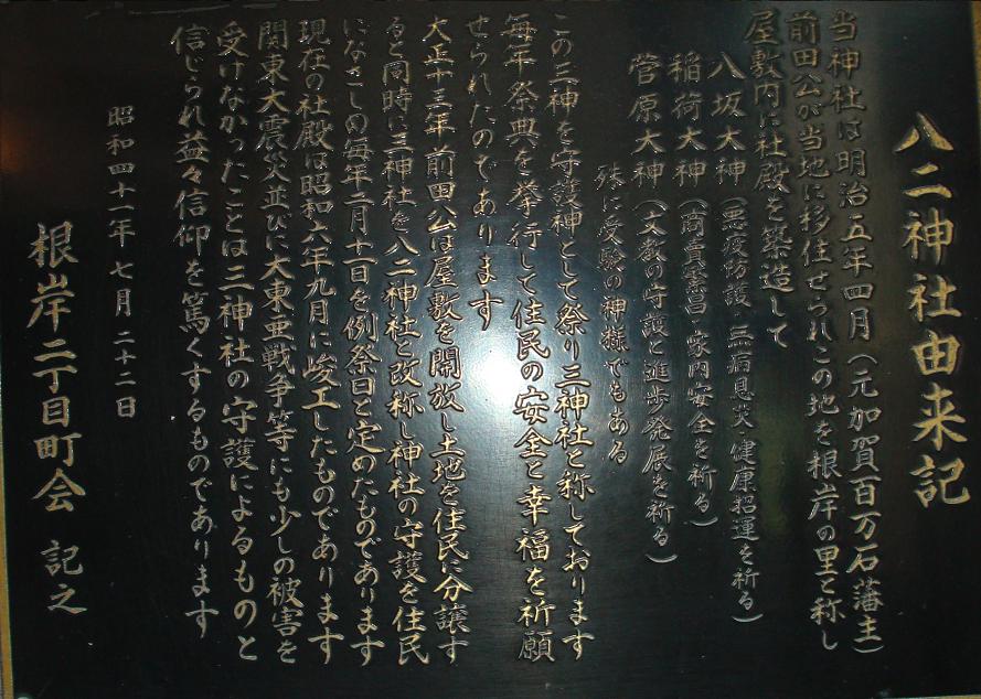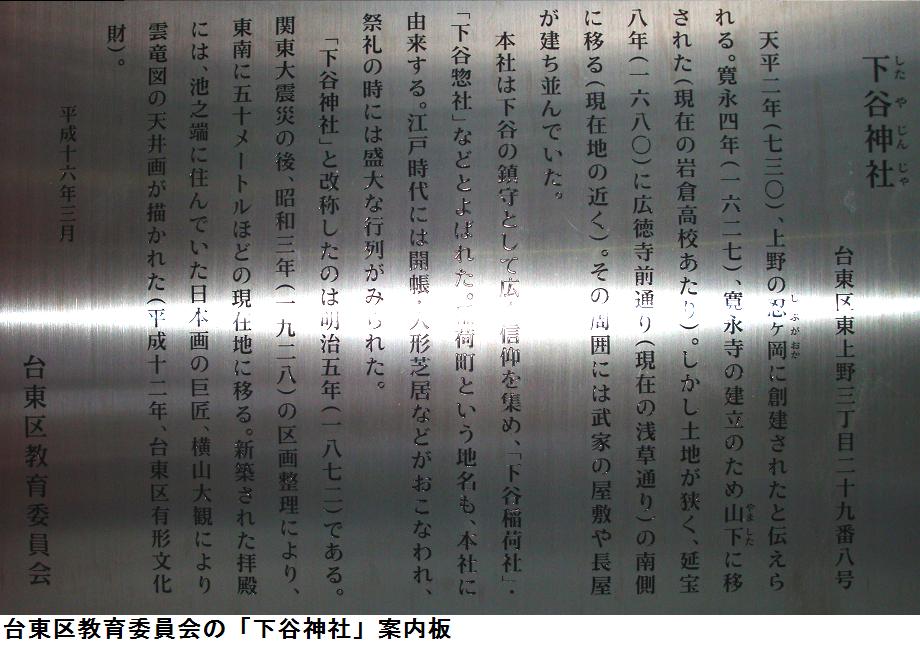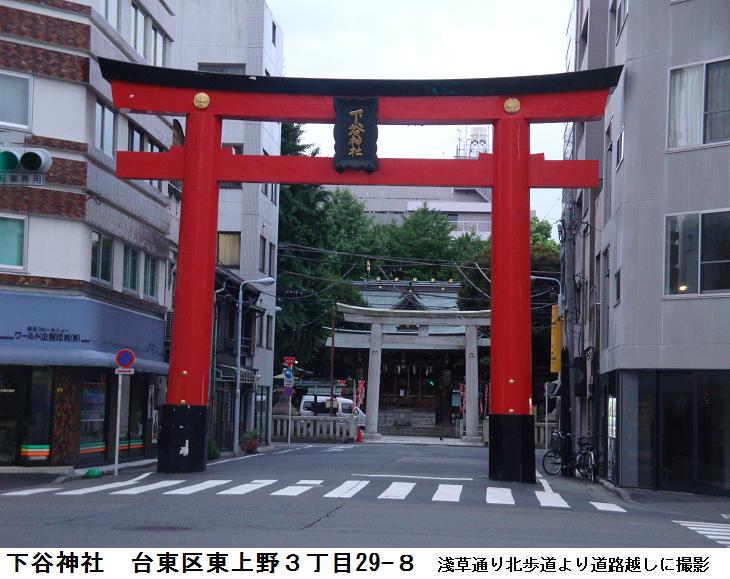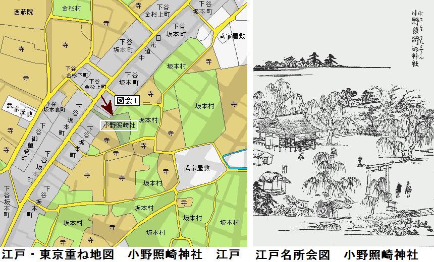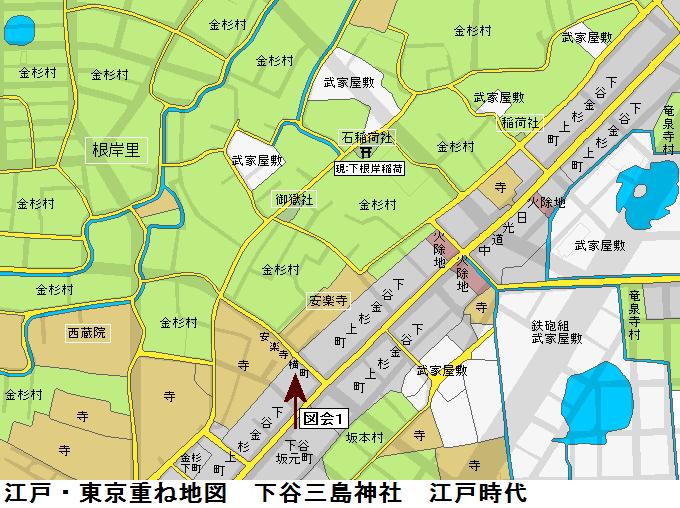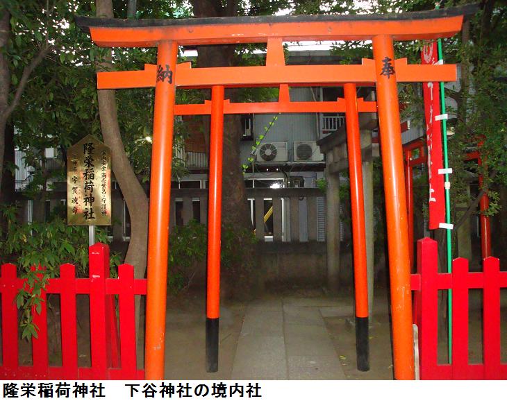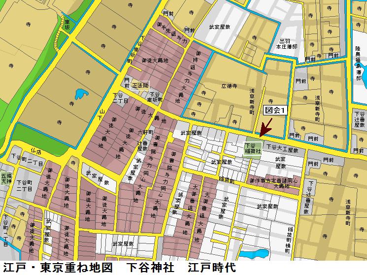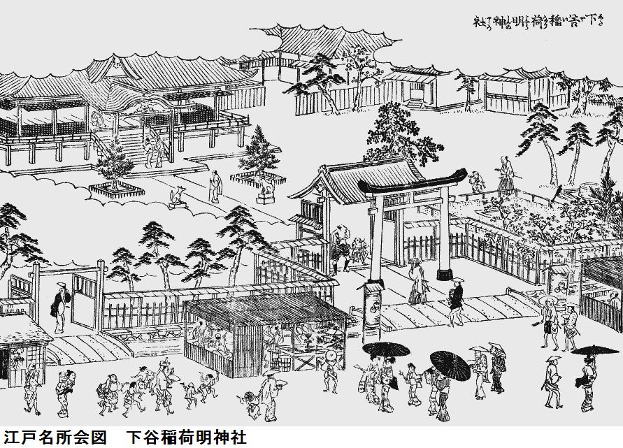 藤原秀郷は騎射(流鏑馬)の祖ともされる武人、おそらくは日本武尊に戦勝を祈願したのであろう。稲荷社でも京都の藤森神社は素盞鳴尊と日本武尊等を祀り武芸(馬術)の神となっているので、藤原秀郷時代に藤森稲荷系の稲荷と関連していた可能性もあるかもしれない。それ以前では、お隣の五条天神社(上野公園内)が出雲の神と日本武尊を祀っていた状況と同様に、上野山の古墳群の被葬者達(おそらくは出雲系の人々)が祀っていた神々が大年神であり、日本武尊東征がこれと結合し、聖武天皇寺代での創祀となったのではないのだろうか。縁起に1627年に寛永寺建立(1625年)で上野山から山下に移転し、狭いために1680に広徳寺門前に移ったとある。江戸地図の山下に正法院がありここが別当となっているから当初はその付近に移転していたのかもしれない。