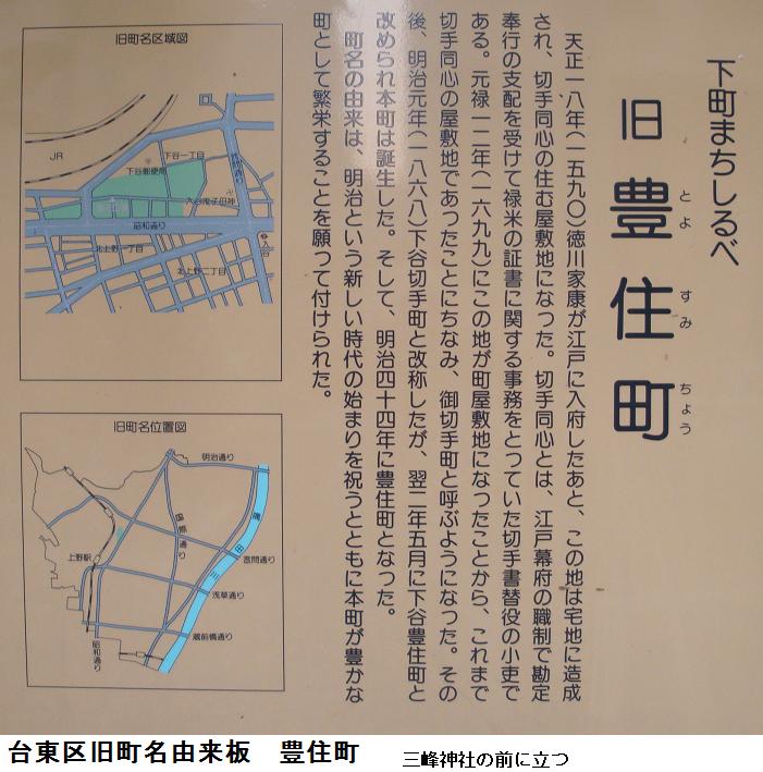 高いビルが立ち並ぶビルの袂にどうかすると見過ごしそうな小さな社がある。これが三峰社で、この近くはその昔豊住町といったらしい。社の前に台東区の旧町名由来板が立っている。