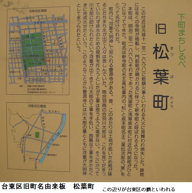 昭和通りにでるとここを少し南下して、かっぱ橋本通りを東に進む。台東区は東京23区の中でももっとも面積の狭い区であるというが、此処曹源寺(かっぱ寺)辺りが、台東区の臍に当たるらしい。この辺りはその昔松葉町といわれたらしく、通りの両側にはあちこちに河童の置物が見られる。
