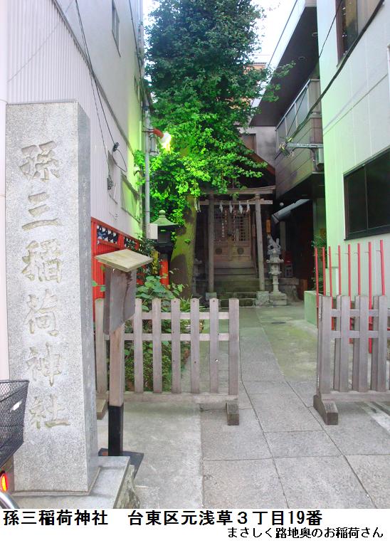 言問通りから国際通りへ、寿2丁目の信号まで南下。ここから右折して2つ目の信号の所に菊屋橋公園という小さな公園がある。左折して少し南下すると、右側に「孫三(まごぞう)稲荷神社」というのがある。このあたりは、その昔浅草阿部川町といい、元禄9 (1696) 年、それまでの幕府下級官吏の大縄拝領地から代官細井九左衛門の支配地となり、その翌年誕生した町である。町名は、この地の地主が皆 現静岡市内の安部川から移ってきた者であったため付けられたという。