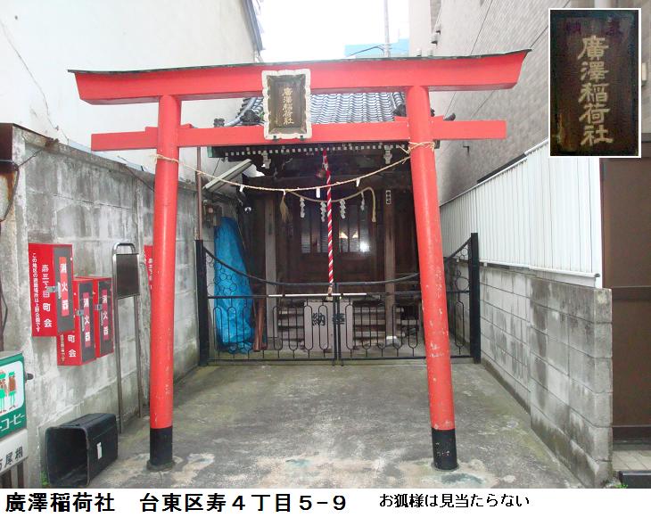 廣澤稲荷社については、境内にある寿3丁目町会の案内板に曰く「『宇迦之魂神』を祭神とし古くは田原町(旧町名千束郷広沢新田のうち紙漉町部分を改名)あたりに鎮座されたのを浅草寺門前町の発展に伴い当時佐倉藩堀田家の屋敷の馬場の一隅の現在地に移転されたといわれます。鎮座されて以来町民先達に依り厚く守護され本日迄町内安全火防の神様としてお守りを頂いて居ります。/今度、町会発足50周年を迎え神社の敷地に付き地主世田谷区在住 土屋徳之助様に御相談申し上げました処、永年にわたり町会員崇敬者により守護されている意を汲まれ、50周年記念として計台地を贈与頂ける事と相成りました。誠に有り難く、ここに神社の経緯と土屋様の御意志を永く伝えるべく記念の標を建てることにいたしました。/平成13年5月吉日/寿3丁目町会」