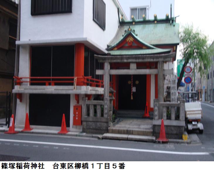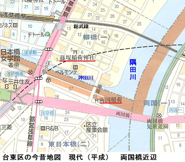 前々から気になっていたのであるが、「台東区の今昔」という地図の今(平成)版の記載によると両国橋の直ぐ手前に「両国稲荷」という書き込みがあり、柳橋を渡って気をつけて見回しては見るのだが、ビルが建っているだけで、社らしきものは見当たらない。同じ地図に柳橋に「篠崎稲荷」の記載もあるので、訪ねてみることにした。