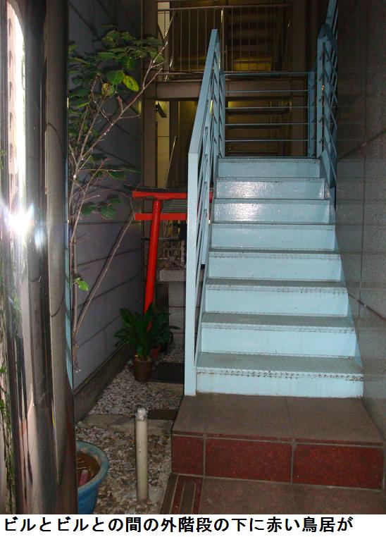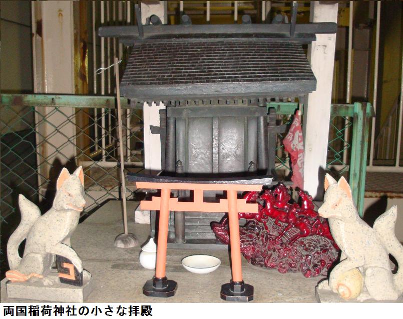 神田川に架かる柳橋を渡り、真っ直ぐ靖国通りに出ると北側歩道を両国橋に向って、注意深くビルの谷間等覗き見しながら歩いた。ビルとビルの間の外階段に隠れて、何やら赤い鳥居らしきものが見える。空き巣狙いに間違えられるのではと心配しながら、足元の悪いビルの谷間に入り込んでみた。あった、あった。社名こそ見えなかったが、正しくお稲荷さんだ。紛うべきことなく地図の場所と同じなればこれぞ「両国稲荷」に違いない。