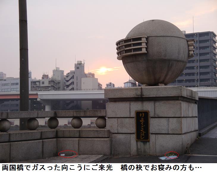 ビルの谷間から出るとガスッた東の墨田区の空の上にご来光。両国橋の袂では2人の風流人がまだまだ白川夜船。今月末は衆議院議員の選挙。ワイワイ騒いでいるのは、立候補した当のご本人とマスコミだけ。自爆テロなんて起こる心配なんて全くなし。まあ、日本は平和だね。