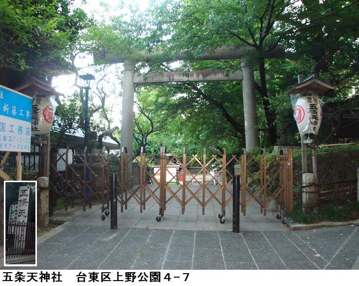 五条天神社は日本武尊が東征のおりに上野忍が岡を通った時、薬祖神二柱に加護を受けたことを謝して、此の地に両神を祀ったことを縁起とし、幾度か変遷を重ねて昭和3年9月に創祀の地に最も近い現在地に遷座したという。祭神は大己貴命(おおなむちのみこと、大国主命の若い頃の名)と少彦名命(すくなひこなのみこと)の2柱、菅原道眞を配祀する。