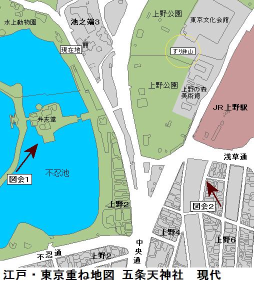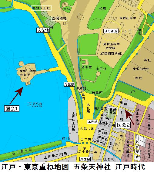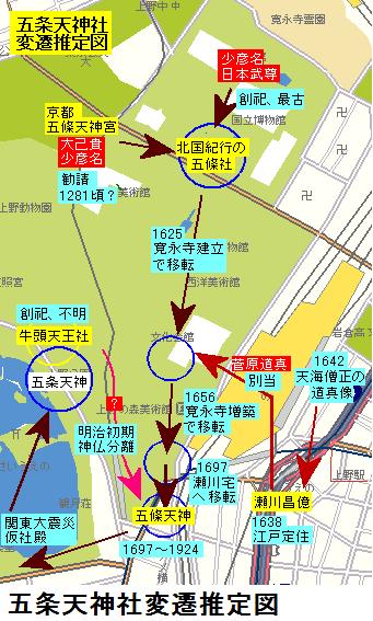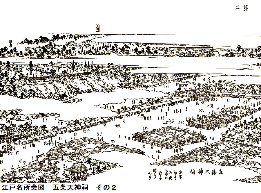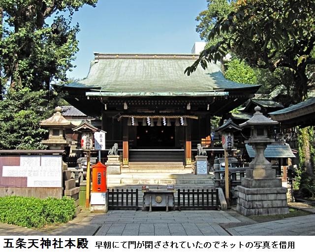 江戸末期の地図の現在地のすぐ北に牛頭天王社(別当は寛永寺末寺の妙教院)があるが現存していない。牛頭天王社は平安末期~戦国時代の疫病退散の関連で登場する社で、当地の牛頭天王の縁起は判らないが、明治の神仏分離で消えたか、五条天神社に吸収されている可能性もありそうである。