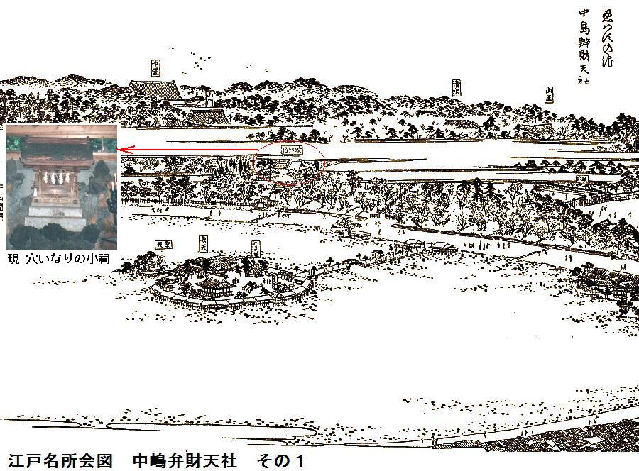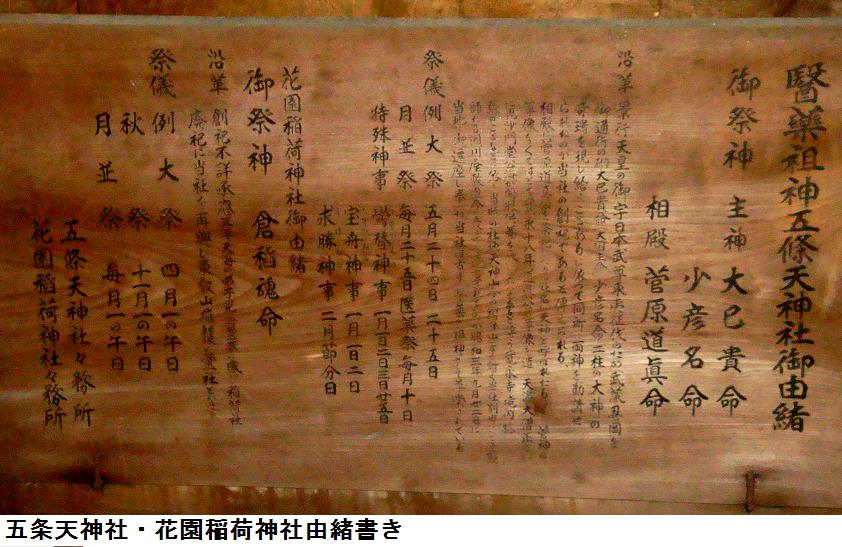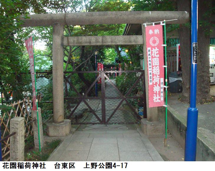 五条天神社に隣接して花園稲荷社(御祭神、倉稲魂命)があるが、旧名は忍岡稲荷で寛永寺建設に伴って勧請されたとも太田道潅の勧請ともされていてはっきりしない。江戸地図では付近が寛永寺の柳花畑となっているので、花園の名はそこからのものであろう。江戸名所図会の不忍池中島弁財天の図(図会1)では「穴の稲荷 赤丸」として描かれており、現在も「穴の稲荷」の祠があるという。