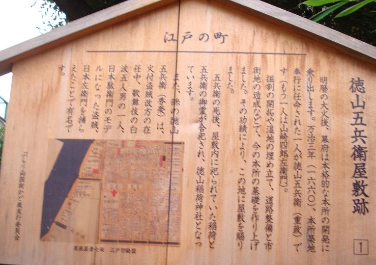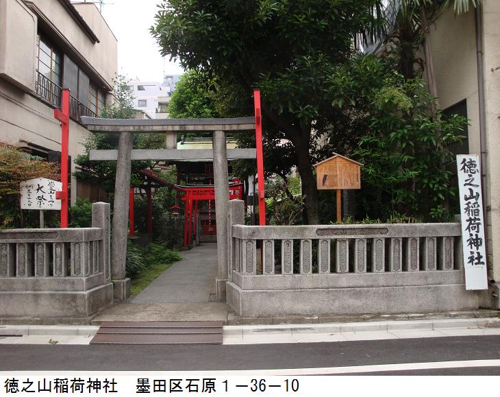 徳之山稲荷神社は旧幕臣徳山五兵衛重政の邸内社であったのでこの名がある。重政は三河譜代の幕臣で亀戸に天満宮を勧請、深川長慶寺を中興した人である。万治3(1660)年に山崎四郎佐衛門重政ととも初代本所築地奉行(二人重政といわれた)となり、本所・深川の都市計画と埋め立て、掘り割り開削、架橋を行う(現在の墨田区、江東区にみられる整然とした碁盤の目状の街路網はこれを基本としている)、本所開拓に功績があった。寛文4(1664)年、その功によって本所築地小屋に屋敷を賜ったのがこの社地の所在地であったという。重政の孫の重舊(しげとも)は、先手御鉄砲頭から後に火付盗賊改方に就任し、盗賊日本左衛門の捕縛に功績を挙げたという。
