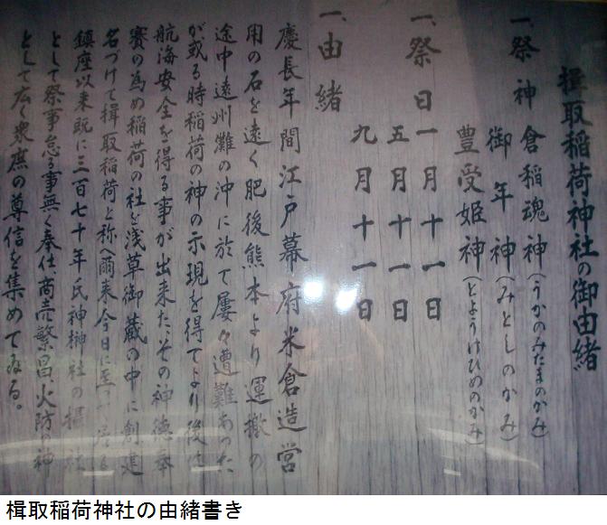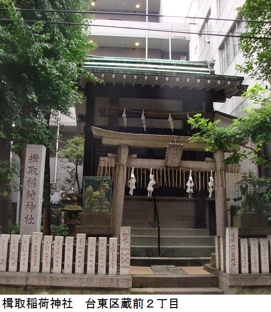 蔵前橋を渡り、江戸通りにでる手前の所に楫取稲荷神社というのがある。なんだか、今日はお稲荷さんに憑かれた朝であった。花火の鉄柵取り付け工事が進んでいる隅田公園をぬけて帰宅した。万歩計は11771歩、7.6kmを記録していた。