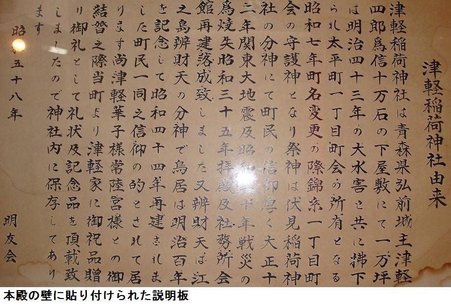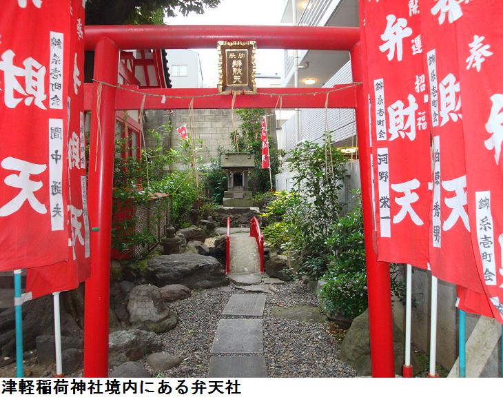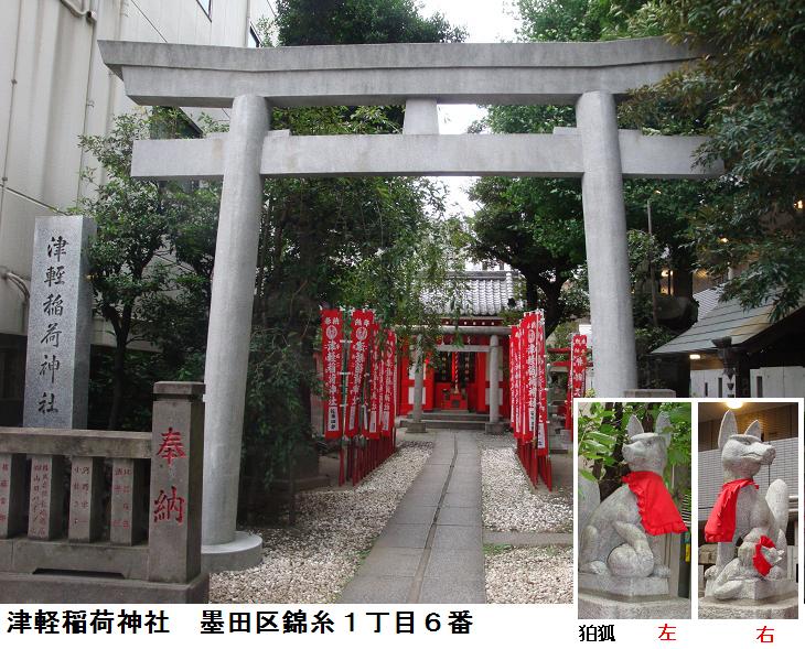 「本所に過ぎたるもの二つあり、津軽大名、炭や塩原」と言われた弘前藩津軽家の下屋敷の跡である。屋敷内に祀られていた稲荷神社のため、津軽稲荷神社と呼ばれているという。説明板にある津軽四郎為信(1550~1608年)は弘前藩の初代藩主である。津軽氏は、元は大浦氏といい、南部氏の支族であったといわれているが、初代藩主となる為信は、南部家の混乱に乗じて独立し、豊臣秀吉の小田原攻めに参陣して大名の地位を公認され、その後、関ヶ原の戦いでは徳川家康に味方して藩の基礎を築き、以後津軽氏が津軽地方を治めた。こうした経緯から、南部藩と津軽藩の間で争いが絶えず、文化5年(1808年)には、南部藩士の下斗米秀之進(かとべひでのしん、1789~1822年)が津軽寧親(つがるやすちか、1765~1833年、津軽藩9代藩主)の暗殺を計画したいわゆる「相馬大作事件」が引き起こされたこともあったのである。