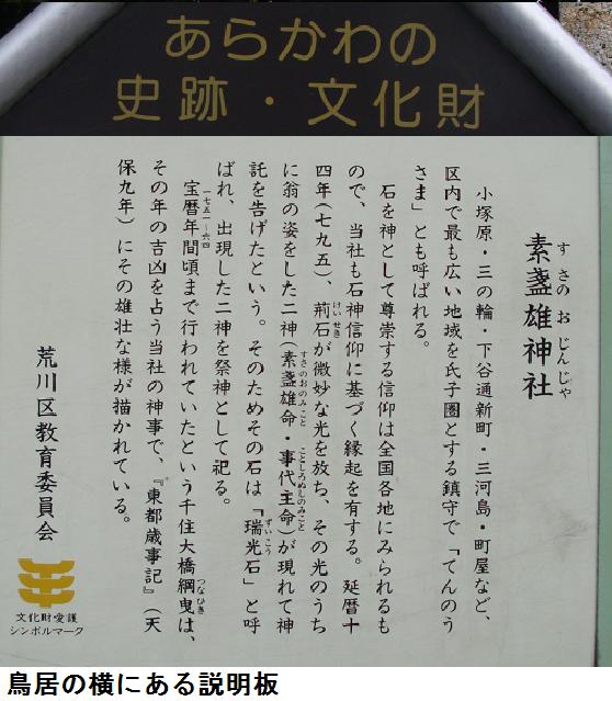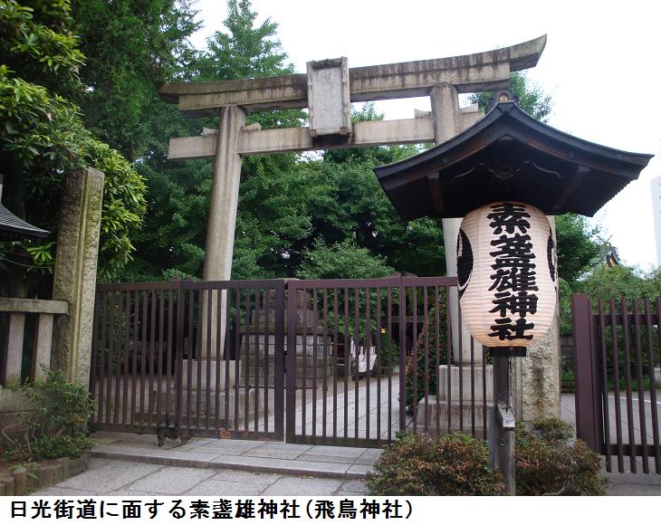 素盞雄神社(飛鳥神社)の祭神は素盞雄命、事代主命(飛鳥大神)、大己貴命(おほなむち、大国主の若い頃の名前)で、境内には稲荷神社・菅原神社などいくつかの併社がある。当社の縁起由来では、「開祖の黒珍(こくちん:修験道の開祖役小角の高弟)の住居の東方小高い塚上に奇岩があり、黒珍はそれを霊場と崇め日夜斎戒礼拝すると、延暦14(795)年4月8日の夜、小塚の中の奇岩が突如光を放ち二柱の神様が翁に姿を変えて現れ、『吾はスサノオ大神・アスカ大神なり。吾れを祀らば疫病を祓い福を増し、永く此の郷土を栄えしめん』と神託を授け、黒珍は一祠を建て鄭重に祀り、当社が御創建された」とある。スサノオ大神の御社殿を西向きに、アスカ大神の御社殿を南向きにそれぞれ造営し、神霊を遷したが、享保3(1718)年類焼による両社炎上のため、同12年に相殿(あいどの:一つの御社殿)として二柱を祀る御殿(瑞光殿:ずいこうでん)を新たに建築し奉斎したという。