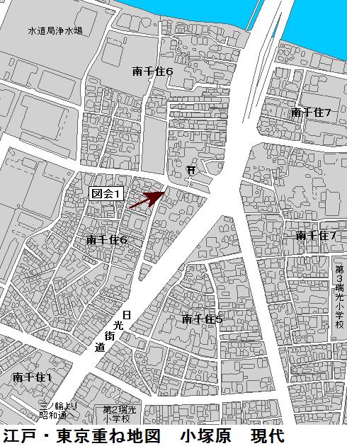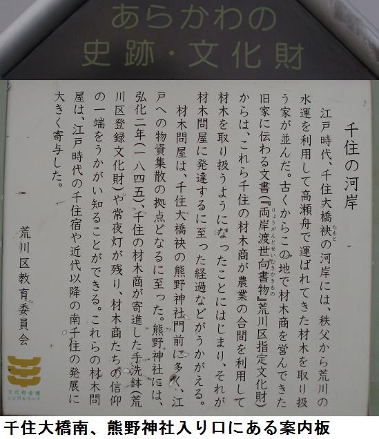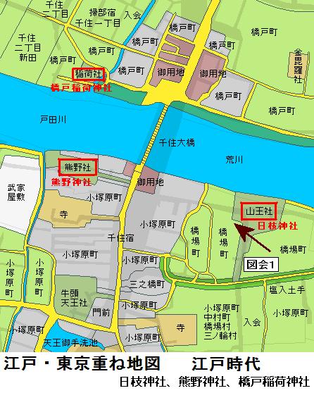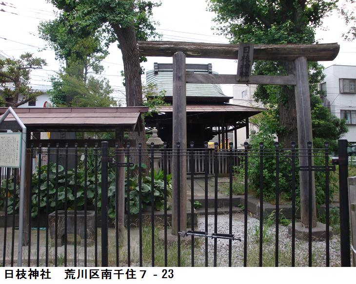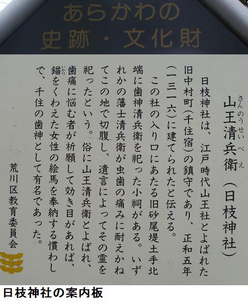 日吉(日枝)・山王信仰の祭神は大山咋神(おおやまくいのかみ)といわれる。「咋」は「杭」と同義で、山に杭(くい)を打って「ここは私の所有地だよ」とすることを意味する。つまり、この神は山の所有者という訳である。しかし、ここは千住の日枝神社は1316年に建てられたと伝えられる千住宿の鎮守であったということで、江戸時代には山王社と呼ばれていたそうで、その他の詳細は不明。案内板にある清兵衛の小祠も何処にあるか判らなかった。江戸時代に浅草の日本堤以北に拡大していった地域を守る塩入土手が千住宿を起点にして此処の南を通っている。